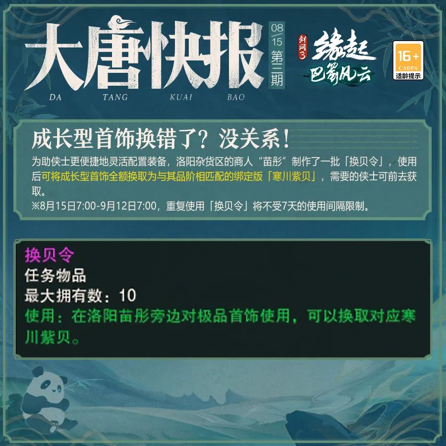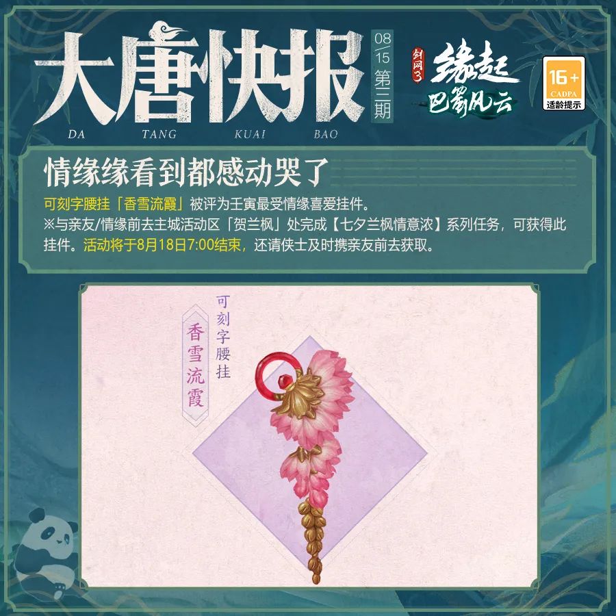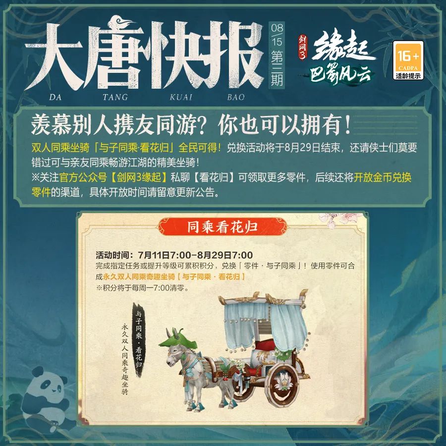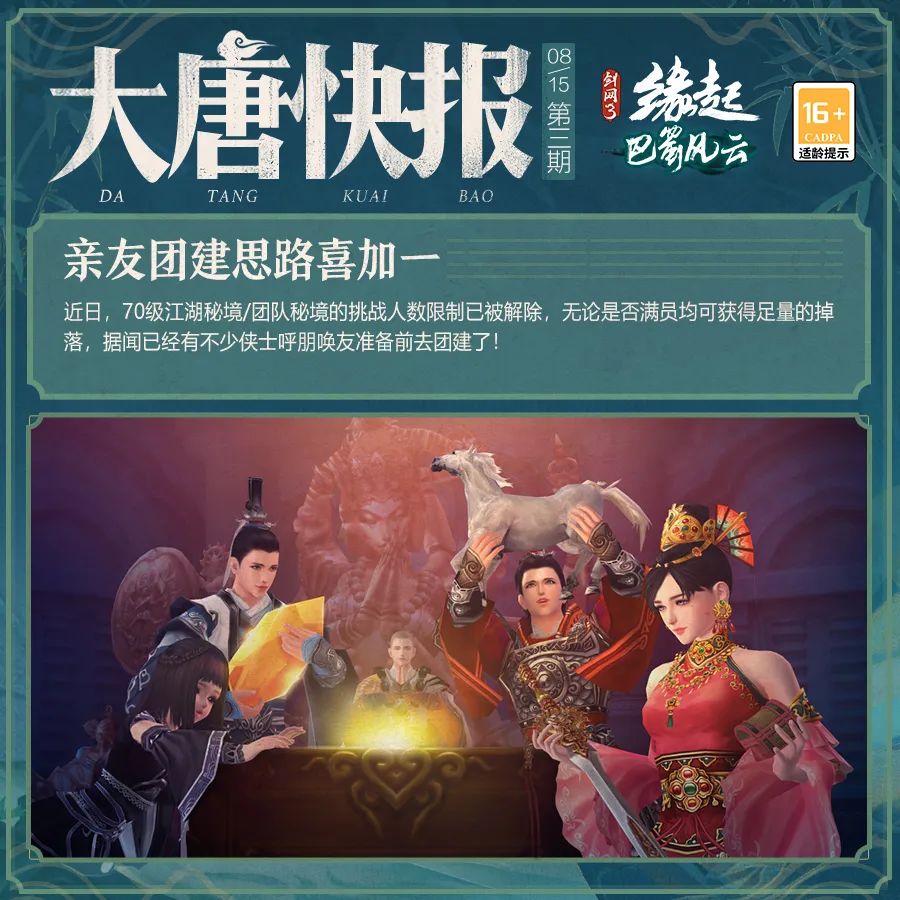 新一期充消赠礼来啦!多样新品外观将于8月18日开售,1.5倍积分回馈限时开启!本期充消豪礼除了精美挂件外,还有毛绒绒的牦牛「雪负苍山」!骑着牦牛,你就是大唐gai上最靓的崽!一起来看看本周大唐快报。 大唐快报 大唐快报第三期!快下拉查收本周大唐江湖新闻锦集~01首饰退换 听闻有一些侠士不小心换错了首饰,洛阳商人“苗彤”紧急制作了一批「换贝令」,侠士们可以去将换错的首饰重新换成「寒川紫贝」啦~ 02归墟秘境满星首通 归墟秘境22层首领苏髓上周才四处宣扬天一教无敌的言论,紧接着便被「缘起稻香」服务器的「雪时雨」/「是猫猫呀」侠士击败! 这个故事告诉我们,flag真的不能乱立! 03萌新教学团开课啦 第二期萌新教学团开组!欢迎萌新侠士和老江湖们报名入团~ ??我是萌新教学团报名传送门?? 04团建新去处 报告!70级秘境挑战人数限制解除,掉落不会再被黑掉啦~好玩的团建方式增加了! 05「看花归」零件获取 听闻有萌新侠士被双乘坐骑「看花归」吸引,无奈入江湖时日尚短,恐不能在活动结束前获取足够零件。缘起娘来提醒大家,关注剑网3缘起公众号可以获取更多零件! 06最受情缘欢迎腰挂 七夕活动火热进行中,可刻字腰挂「香雪流霞」被评为年度最受情缘喜爱挂件!请感兴趣的侠士抓紧时间在活动结束之前获取哦~ 07升级神助攻! 玄九灵丸活动延长,还未满级的侠士可以更快升级,早日开启更加丰富的江湖旅程啦! 更多活动资讯,请关注叶子猪《剑网3怀旧服》官方合作专区。 |