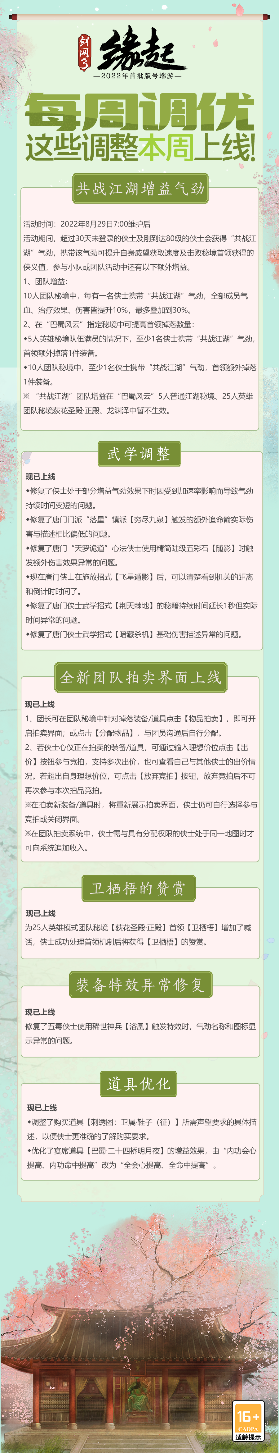 共战江湖气劲上线,强力增益助力行侠;江湖武学新调整,招式问题已修复;团拍界面焕新升级,拍卖更灵活更便捷;宴席道具优化;装备特效异常修复完毕...以下内容本周调优上线,点击下图放大查看详情吧! 以上就是本期的全部内容,赶紧上游戏看看吧,更多资讯,尽在叶子猪《剑网3缘起》官方合作专区。 |