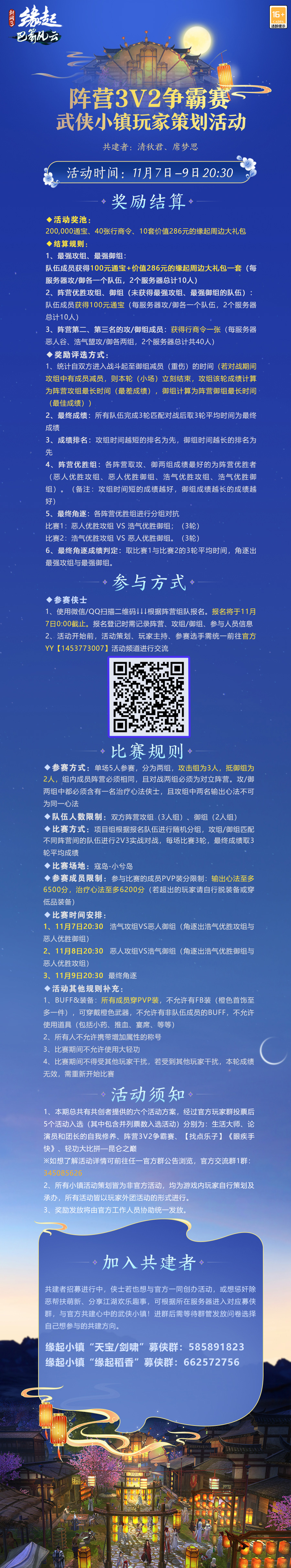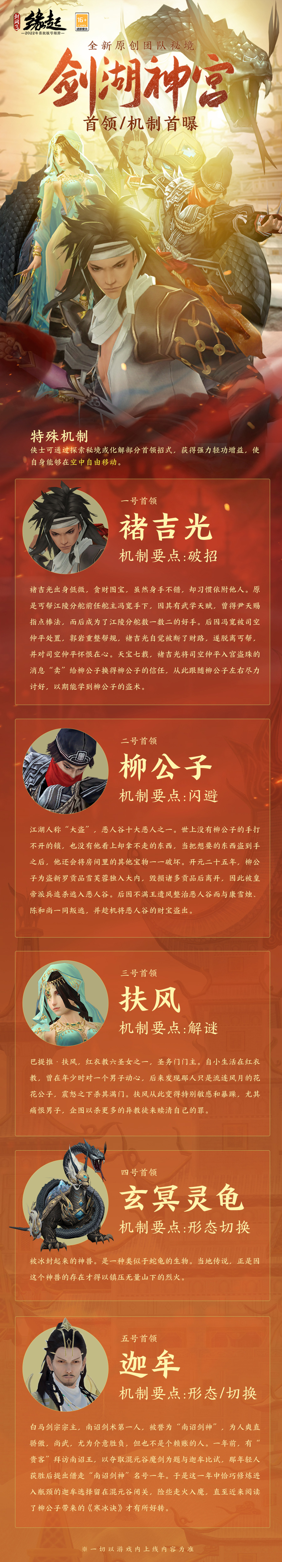据官方消息,新赛季“剑湖神宫”公测定档于11月24日!而今天给大家带来了新秘境“剑湖宫”首领信息以及阵营3V2争霸赛等新活动资讯,精彩内容不容错过,感兴趣的小伙伴快来看看吧! 步如风赴新宴 江湖旧页欲翻 武侠小镇发布重要公告,新赛季【剑湖神宫】将于11月24日正式上线! 赛季加速活动开启!11月7日7:00-11月24日7:00活动期间,侠士每日完成赏金任务/阵营日常,可获得双倍侠义值/威望/战阶积分,侠士每周前五场名剑大会胜利所获名剑币加倍,80等级团队秘境首领增添额外装备掉落! 首领情报揭秘 剑湖迷踪初探 无量山下混元深谷本是绝佳修炼之地,因常有修炼失败的高手遗失神兵于此而得名“剑湖”,后来阿萨辛派扶风将此地修建成红衣教在南诏的分部。彼时三大恶人叛逃出谷,谷盟之人寻踪而来,却见剑湖宫内藏奸纳邪,侠士们与五大首领的激战一触即发……本期小镇密报为侠士们揭秘全新原创团队秘境【剑湖宫】的首领信息及机制要点。 10人普通模式【剑湖宫】将于11月7日上线体服,欢迎侠士前来体验,更多建议可在游戏内点击【Shift+H】反馈。 阵营3V2争霸 攻御角逐酣战 矛塑之极锐,盾坚如磐石,碰撞火花迸溅。武侠小镇第三期玩家策划活动【阵营3V2争霸赛】将于11月7日-9日每晚20:30进行,热血竞技不容错过!名列前茅者可得永久珍稀蝴蝶背挂、海量通宝及行商令奖励。感谢策划并主持此次活动的玩家,欢迎更多侠士加入共建者,发挥脑洞,共创更多好玩的活动。 《剑网3缘起》“巴蜀风云”火热公测,免费畅玩!“剑湖神宫”公测定档,平行世界全新内容即将上线!新赛季海量资讯逐步曝光,武侠小镇趣味活动侠途添乐。欢迎各位侠士重游故地,回到梦开始的地方,追寻昔日江湖情! 更多《剑网3缘起》相关资讯,可以关注叶子猪的《剑网3缘起》官方合作专区 |