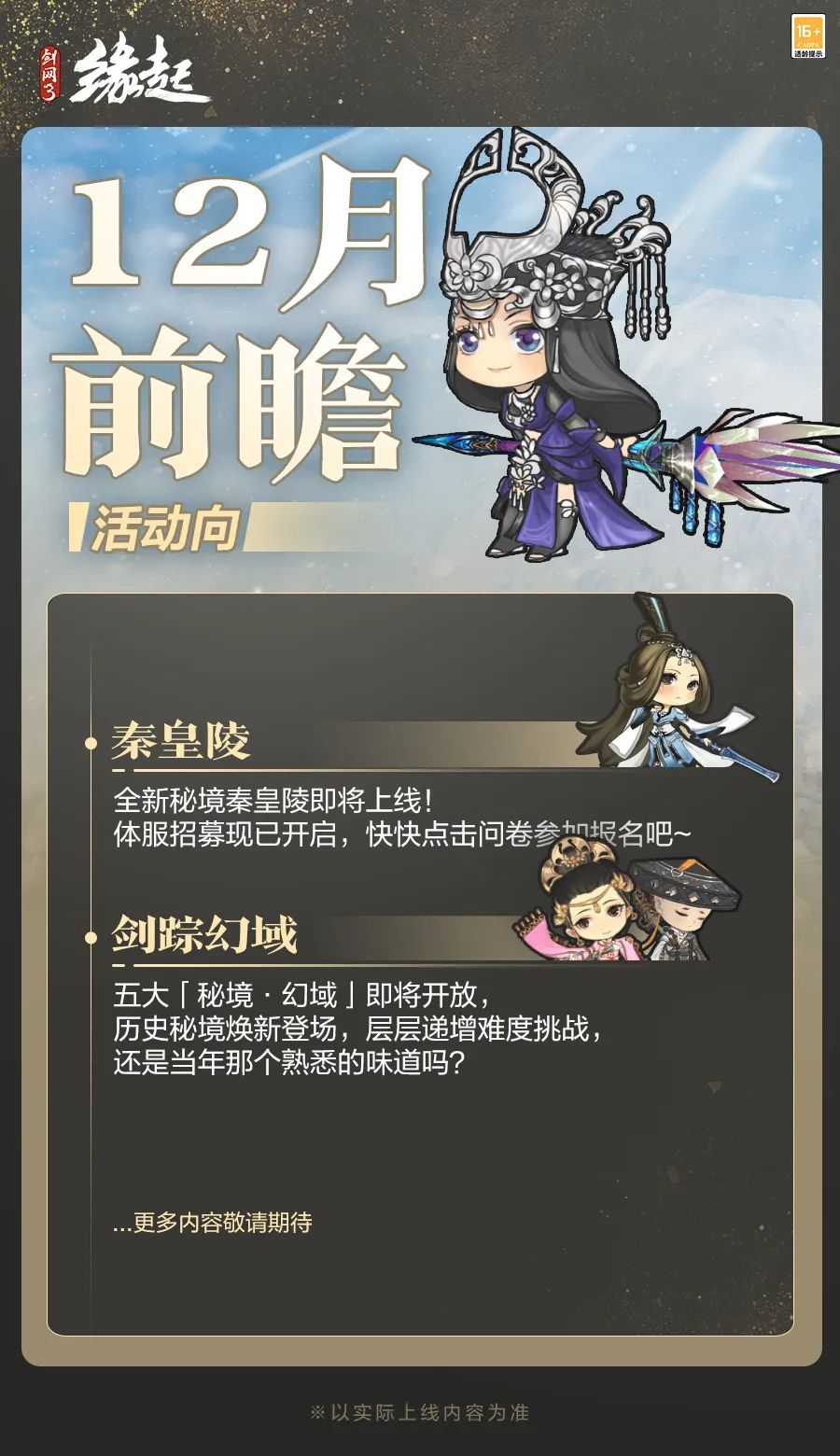 今天是11月19日,星期二! 11月已经要迎来尾声啦,在即将到来的12月,寒冬将至,热血不息!让我们一起看看十二月的精彩活动吧! 全新秘境秦皇陵登场!测试服招募进行中,点击游戏右上角问卷提交申请,进本快人一步! 全新系列秘境「剑踪幻域」即将上线,怀旧秘境摇身一变,还会是你熟悉的味道吗? 更多后续报道,请继续锁定叶子猪《剑网3怀旧服》官方合作专区。 |