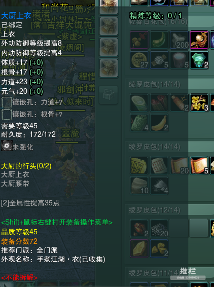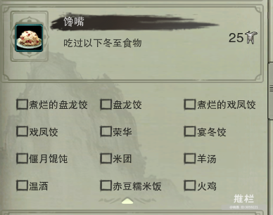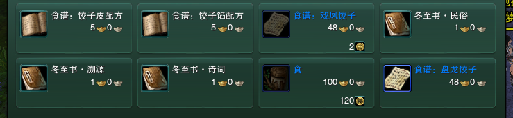 今天小九给大家带来的是冬至活动的所有成就获得攻略,助力大家拿全成就! 1俯瞰荣华 俯瞰荣华这个成就,需要在指定位置吃掉“荣华”,很多世界上的人会卖“荣华”(限时道具),所以不着急完成这个成就的小伙伴可以在活动结束前3-4天去收,如果是最后一天的话,不少玩家反而会竞相抬高价格,以“错过等一年”的理由来高价卖。 我们直接神行到玉虚峰“昆仑山下”站点,这个成就的难点一是荣华比较难搞,二是这个位置太高,不好上去,尤其是有些职业的轻功在这个版本用来爬坡真的格外难。 飞上山我们可以看到这个小亭子,这边就是养生斋的风雨亭了。我们可以看到牌匾上“风雨亭”三个大字。 2冬至好读书 提到阅读成就其实是挺需要运气的,因为目前发现“隐元食鉴!盘龙饺”“团团的画像”需要击败熬油才会掉落。并且需要roll点,如果非常需要的话最好是和亲友或者与一起组队的玩家商量一下,这样更快收集齐需要阅读的书本。 拂林风情录是最简单的,只需要对话西域商人完成介绍任务即可获得,元旦春始记同理。 最后三本书,对话活动商人购买即可。 作者去打了5次熬油,没roll到自己需要的书,希望各位玩家能快速完成这些想做的成就。 3、4饱食 这两个系列成就其实挺难的,有些掌门人是非常能吃的,没十盘八盘还真喂不饱。做饺子宴的烹饪玩家这时候可以大赚一笔了。 5馋嘴 饺子从哪里搞这肯定是不少玩家困扰的问题,我们可以这个npc徐福这边购买饺子皮和饺子馅,然后在一旁的灶台上进行加工成生饺子,然后再去锅上煮成随机的偃月混沌,宴冬饺,戏凤饺和盘龙饺,当然运气好还能出荣华! 用这个锅不耗费体力和精力去做材料和加工,但是运气差的话会出现这个debuff。出现之后2小时没法用锅。 其他五个道具的来源是购买,活动npc处可以买火鸡,赤豆糯米饭和温酒,米团,羊汤。 6、7嬉戏打闹 嬉戏打闹这俩成就比较麻烦,需要做五彩球互相抛,建议交易行蹲一下这两样道具。 8啥时能转行 啥时能转行成就需要装备蓝色品质的装备,大厨上衣和大厨腰带,打熬油有概率出蓝色的装备,目前差个腰带,需要等明天去碰运气了。 9傲油?熬油? 建议五个人一起去打,进入普通三才阵击败四人阵位置的熬油,掉落还是挺丰富的,有概率掉落22格的背包。 10好兆头 福禄寿喜这四个道具在怀旧服,我还没遇到过,不过大量吃总会出的。 11御厨驾到 这个成就显而易见,需要我们装备140品的紫色装备,但是加了寅虎,就可能是1年一个成就,错过绝版的那种。 冬至成就共计11个,希望本篇攻略对大家有所帮助,能迅速完成冬至系列成就。 |