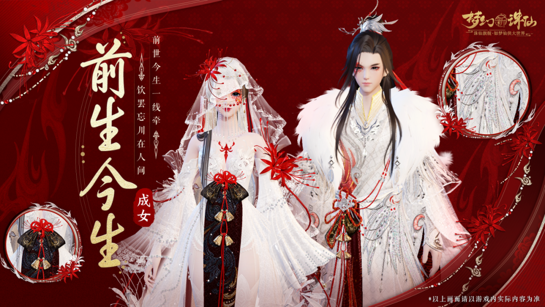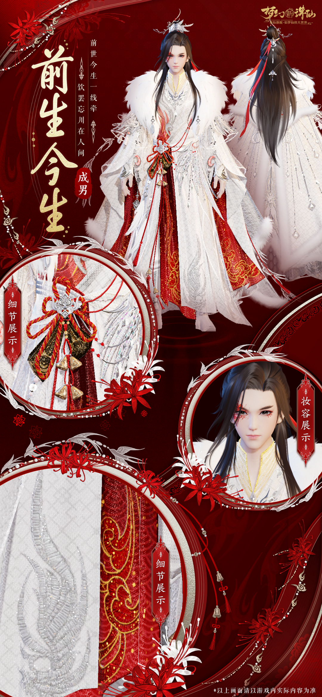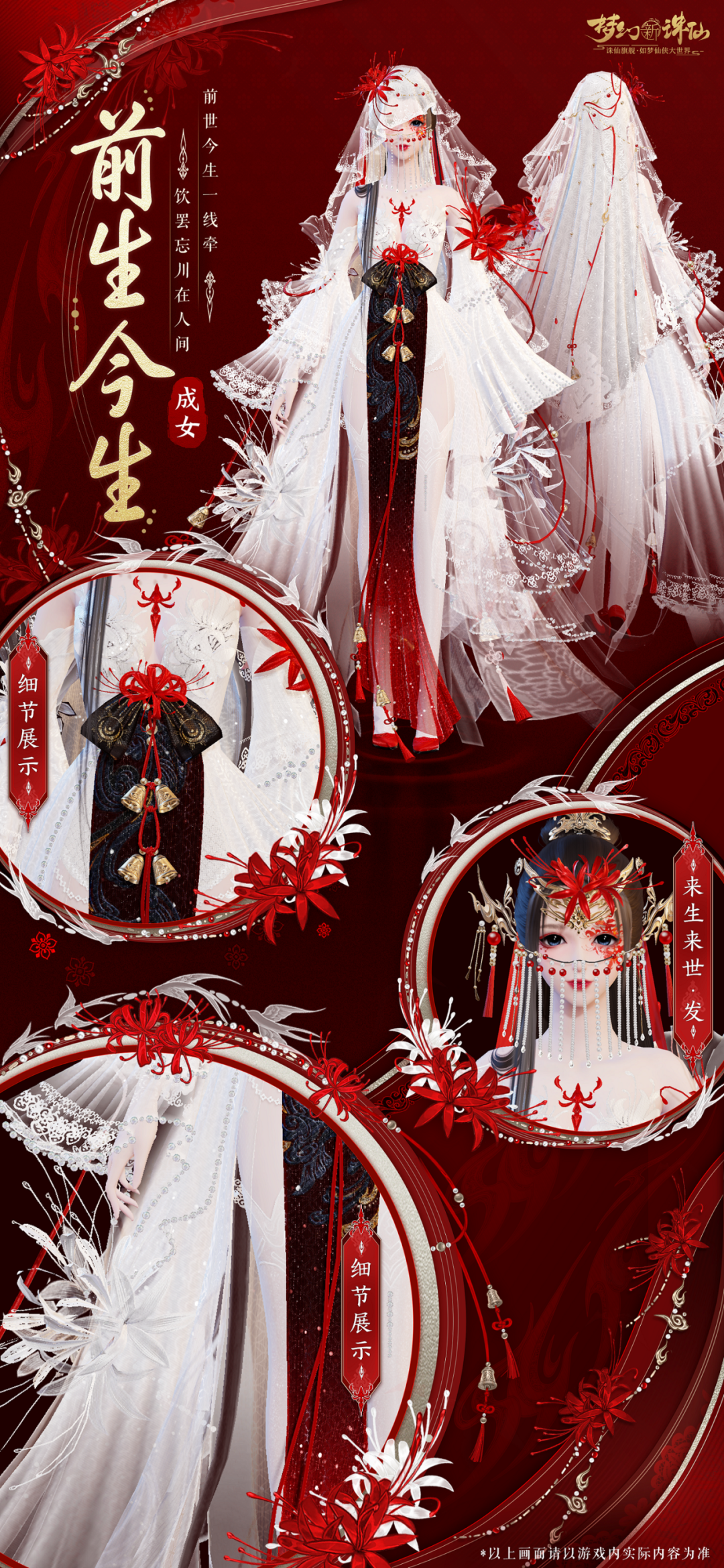 前世今生一线牵,饮罢忘川在人间。 荆棘绽放 传说许久以前,孟婆月老被玉帝选中,然而在修炼成为神仙之前,二人相爱。 玉帝震怒,罚准天神脚踏荆棘,血流成河,绽放彼岸花,香气幽怨,花叶永不相见。 月老背负荆棘诅咒,为人间情侣牵红线,自身却难逃情劫。 成女时装展示 赤红的花朵依偎,纯白轻纱如梦似幻,展现出曼妙身姿,黑红渐变的绸缎轻轻垂地,步步摇曳生姿。轻纱与绸花交织,仙气弥漫,令人心醉。万灵之夜,她最神秘,举手投足尽显妩媚风情。 成女发型展示 发型·前世今生 发型·来生来世 将青丝盘成精美的发髻,缀以红花金饰,再添几分华丽。宝石串联而成,轻轻覆在她的脸庞上,平添了几分神秘与妩媚,令人目不转睛。 成男时装展示 设计优雅流畅,雪白的长袍轻轻垂落,巧妙搭配着朱红的绸缎,整体上又增几分热烈。精致的毛领环绕在肩,更添一份奢华与高贵的气质。他有不可一世的威严,步履间尽显王者风范,令人敬畏三分。 少女时装展示 纯白的轻纱随风而动,腰间的绸缎编织成花,轻轻摇曳,灵动与飘逸呼之欲出,仙气飘飘,满是轻盈与梦幻。宝石穿成的脸链轻覆花容,搭配上白色兜帽,万灵夜最神秘的精灵非她莫属。 少女发型展示 发型·前世今生 发型·来生来世 精致的头饰上镶嵌着一颗红色宝石,闪烁着璀璨的光芒,与额头的贴花相映成趣,乌黑的长发垂下,更添几分不凡与优雅的气质。 少男时装展示 长袍以白色为主色调,配上朱色披风,交织出一种既纯洁又热情的氛围。金色的腰带熠熠生辉,有一抹别样的光辉。剪裁得体,彰显出端庄大方的气质,传递出的高贵神秘的气息。 忘川河畔 孟婆也因爱受罚,容颜尽毁,囚于地府。阎罗怜悯,使其在忘川河畔,以泪洗面,熬人间泪水成孟婆汤。忘川水无倒影,奈何桥边无镜,每一碗汤,都是对过往的告别,却难舍心中挚爱。 妆容展示 原色效果一览 染色效果抢先看 染色色号参考(上下滑动查看) 1.白色套染色,全为#FFFFFFFF 2.蓝色套染色 成男 头: #FFFFFFFF #181818FF #121214FF 身体: #101011FF #2E375DFF #040404FF #141418FF #000000FF #1A1B26FF #000000FF 少男 头: #FBFBFCFF #333437FF #7A87EFFF 身体: #050505FF #34353CFF #242427FF #292C33FF #000000FF #333742FF #26282EFF 少女 头: #FFFFFFFF #CDD3E1FF #313F55FF 身体: #1C1F24FF #1A1A1AFF #191B1FFF #040506FF #2B2C2EFF #374460FF #8D9099FF 成女 头: #E8E9EFFF #666C8EFF #E5E6E9FF 身体: #161719FF #202123FF #0C0C0DFF #0C0D0FFF #080911FF #181923FF #151517FF #888794FF 【红色成女】 (头发) #E6A2A2 #FFFFFF #FF5F37 #D9002C (衣服) #F5000F #96001B #D6293F #F98686 #930000 #FF758C #FD6A72 #FF697F —————— 【红色成男】 (头发) #FFBEC1 #AD6778 (衣服) #3F3F3F #FFA4A4 #FFE5E5 #FF204C #EE0A26 #BF8585 #C80007 #F5E6E9 —————— 【红色少女】 (头发) #E8B5B5 #FFFFFF #D3588C #EA001B (衣服) #E10F00 #931423 #D6294C #EDDBDE #FD6A8A #BFA7AB #FD6A71 #FDAABA —————— 【红色少男】 (头发) #E8B5B5 #FF263D (衣服) #FFFFFF #FFFFFF #E8DBDE #D30000 #E59CB7 #FFFFFF #FE8C90 #F7F8F8 永恒爱恋 月老的红线,轻轻牵动着人世间无数段情缘的相遇。而孟婆汤让人忘却前尘,抚平凡尘的创伤。爱情轮回,每一次的缘起缘灭,都是宇宙间爱的循环,让温情得以延续,让爱永不消逝。 背饰展示 背饰·越彼岸 曼珠沙华开彼岸,三生三世越忘川。 飞剑展示 飞剑·登彼岸 曼珠沙华开彼岸,孤芳远渡是忘川。 梦诛 道友可前往活动「众生礼遇」特惠礼包界面,限时3折,使用金锭带回时装哟~ 今天的霓裳分享就到这里啦,看完是不是迫不及待想换上新装和小梦一起去万灵节美美出片了呢?同时,道友们也别忘记累计签到25天即可免费获得全新发型·傩戏钱面哦! 更多前瞻资讯,请锁定叶子猪《梦幻新诛仙》官方合作专区。 |