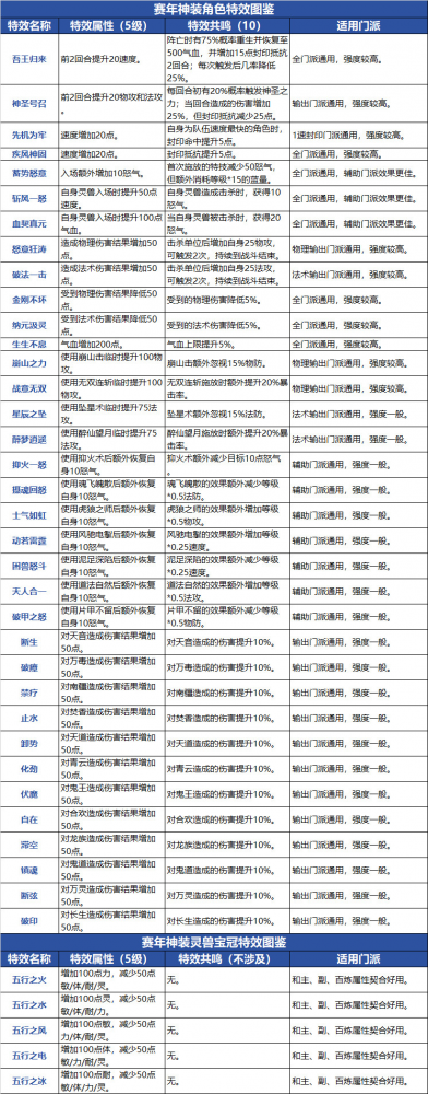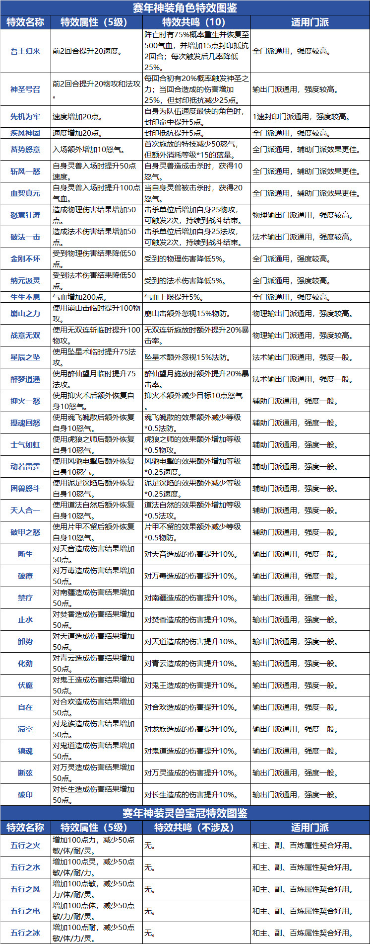 道友们好! 新赛季挑战最近咱可是聊了不少,但别忘了,道友们自身也在新年全面升级!全新赛年神装现已登场——不回收、永久用、属性还能跟着等级一起长!戒指、项链、灵兽宝冠……它们究竟有哪些作用?能为你带来怎样的实力飞跃? 正好有热心道友发来投稿,一起来看看吧~ 作者:@浮世行者 *道友投稿非官方建议,不代表官方立场,道友按需参考哟~ 赛年神装简介 赛年神装分为三个部位:角色戒指、角色项链、灵兽宝冠。 赛年神装不会回收,永久可用。此外,赛年神装是全等级装备,属性将随着角色等级自动成长。赛年神装的副属性,打造时随机生成,最多可拥有三条副属性。 道友还需注意,所有等级段打造成本都一样,类似于铸灵会随着角色等级增加而提升,听说满足要求(红色品质、拥有3条副属性且携带特效)的赛年装备,未来还可以上架本服交易行流通,机会难得,各位道友可要把握住了! 打造所需材料 介绍完了赛年神装的基础知识,咱再来看看打造赛年神装需要些什么~ 神铸百炼打造赛年神装所需资源 ·角色戒指/项链(神铸百炼) 百炼玉 ×6 神铸令 ×24 战装宝玉 ×1 战装神铁 ×1 ·灵兽宝冠 百炼玉 ×3 神铸令 ×12 灵装宝玉 ×1 灵装神铁 ×1 材料获取途径 装备属性范围 角色装备戒指(区分门派) 基础属性范围 物理·白虎之戒基础属性范围:物攻8-44;气血33-165。 法术·苍龙之戒基础属性范围:法攻8-44;气血33-165。 治疗·执明之戒基础属性范围:速度3-16;气血33-165。 封印·陵光之戒基础属性范围:速度3-16;气血33-165。 附加属性范围 物攻8-44; 法攻8-44; 物伤结果8-44; 法伤结果8-44; 物伤减免9-44; 法伤减免9-44; 暴击伤害2%-10%; 速度3-16; 治疗3-16; 封印命中1-5。 百炼属性范围 力/灵/敏/耐/体3-38。 角色装备逐光之链(不区分门派) 基础属性范围 物防8-88; 法防8-88; 气血16-165。 附加属性范围 物防17-88; 法防8-44; 物伤结果8-44; 法伤结果8-44; 物伤减免9-44; 法伤减免9-44; 暴伤减免4%-17%; 气血22-110; 抗封1-5; 闪避1%-5%。 百炼属性范围 力/灵/敏/耐/体3-38。 灵兽装备逐光宝冠 基础属性范围 物攻4-40; 物防4-40; 法攻4-40; 法防4-40; 速度2-20。 附加属性范围 物攻10-50; 法攻10-50; 物伤结果10-50; 法伤结果10-50; 暴击伤害4%-20%; 物防10-50; 法防10-50; 物伤减免10-50; 法伤减免10-50; 暴伤减免4%-20%; 速度5-25; 气血20-100。 百炼属性范围 力/灵/敏/耐/体12-30。 特效&共鸣图鉴 赛年神装拥有神装特效,神装特效有等级概念,最高为5级。等级越高,特效效果越好。角色戒指和项链拥有同名特效时,叠加生效,可激活特效共鸣。共鸣效果有5档,当同名特效等级之和达到4/6/8/9/10级时,可对应激活1至5档共鸣效果。 接下来,就给大家介绍一下赛年神装特效和共鸣的全图鉴,道友们可保存图片随时查阅哦~ 目前来说,特效虽香,但前期不建议硬追,不仅选择多,还容易“歪”(与自身属性不匹配)。建议道友们优先保证面板属性,等后续交易行开放后,再慢慢收集搭配,会更轻松哦! 打造活动 现在还有「天铸神兵」打造活动火热进行中,助你备战新赛季,神装到手更轻松! ·打造优惠 活动期间,打造赛年装备所需神铸令和百炼玉限时减半,更有神铸令礼包限时3折~ ·打造祝福 还有打造祝福、词条祝福、特效祝福三重幸运加成,活动期间打造出额外词条和特效的概率会更高! ·天铸奖励 完成“天铸奖励”任务,即可领取丰富道具与打造材料,助力无忧毕业! 如此良机,可别错过啦!赶紧冲一波,把你的专属神装带回家吧~ |