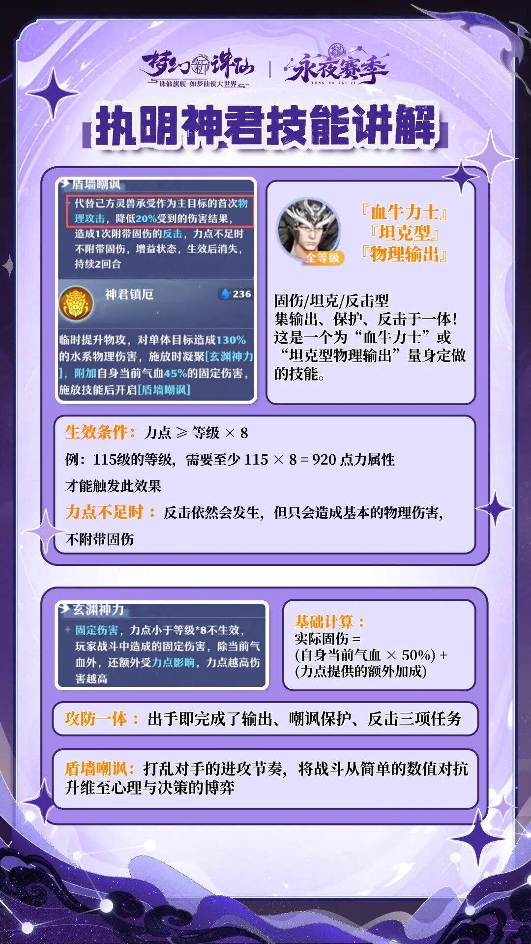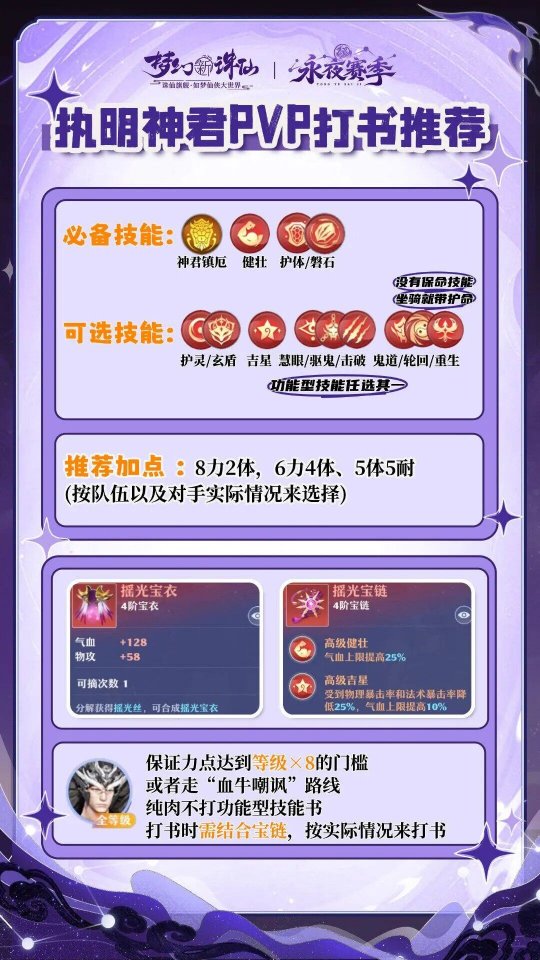 那么,该如何培养执明神君,才能最大限度地发挥其实力呢?小梦收到了一位热心道友的投稿攻略,接下来就让我们一起看看吧! 作者:@小妤、梦幻新诛仙攻略组 *道友投稿非官方建议,不代表官方立场,道友按需参考哟~ 一、执明神君核心机制拆解 1. 定位与核心技能解析 执明神君的核心定位是「辅助型物理反击宠」,主打“攻守一体”作战模式。单次出手即可完成输出、嘲讽保护、反击三件事,适配各类需要前排承伤以及PK阵容。 【神君镇厄】 临时提升物攻,对单体目标造成 130%的水系物理伤害,凝聚[玄渊神力],附加自身当前气血 45%的固定伤害,施放技能后开启[盾墙嘲讽]。 [玄渊神力]:力点小于等级*8 不生效,玩家战斗中除当前气血外,伤害数值额外受力点影响,力点越高伤害越高,面对敌方法系灵兽或者法师攻击时,即便触发嘲讽也无法发动反击,实战中需针对性规避敌方法系输出。 [盾墙嘲讽]代替己方灵兽承受作为主目标的首次物理攻击,降低 20%受到的伤害结果造成 1 次附带固伤的反击,力点不足灵兽等级*8 时不附带固伤(人物 89 级时宝宝 94 级,也就是 94*8=752,也就是力点≥752 生效),属于增益状态,生效后消失,持续 2 回合。 命格:推荐【黄泉之息】,增加亲和,变相增加免伤和伤害。 2. 适用场景与培养优先级 ·日常推图 固伤效果 100% 生效,但伤害受出手前剩余血量影响,稳定性不如传统的暴龙兽(偃甲龙)、小泥巴以及海娘子(天女兽),较少参与排位天衍等 PK 对战的玩家可以不做。 ·PVP对战 固伤受力点加成显著,嘲讽机制可有效限制敌方物理灵兽或敌方物理的输出节奏,尤其适配运营队或半运营队,作为软控+强制嘲讽核心发挥作用。 培养建议:执明神君凭借特殊的嘲讽机制,拥有不可替代的战术价值决定了其为 PVP而生,资源有限时可不先培养,追求 PVP 的玩家可以优先培养。 二、养成指南 1. 加点方案 ·标配(主流推荐):6力4体,培养果子优先堆体耐属性。增加抗性更大保证生存能力,既能通过高气血提升固伤基数,又能凭借高额免伤和软控扛住物理爆发,有效保护友方灵兽。 ·天道霸霸流(速控流):加点侧重速度,确保快于敌方物理角色以及灵兽。核心思路是先手嘲讽,扰乱敌方输出节奏,为己方创造输出环境,果子需优先补充速度以及体耐属性。 ▲画质严重压缩,游戏内体验更佳 2. 打书推荐 打书核心原则:围绕“生存+嘲讽+反击”构建,根据 PVP/PVE 场景差异调整,优先保证核心技能不被顶掉。 PVP 主流 打书推荐 神君镇厄 + 高级护体 + 高级磐石 + 高级健壮 + 高级迅捷 + 高级格挡/高级护灵/高级吉星 + 高级轮回/高级重生 推荐理由 作为首发宝宝使用,增加物理免伤能更好的限制敌方物理清宝宝能力。 PVP 万灵御令流 打书推荐 神君镇厄 + 高级健壮 + 高级磐石 + 高级护体 + 高级护灵 + 高级毒吸/高级吉星 +高级轮回/高级重生 推荐理由 该宝宝容易成为法宝宝突破口,所以可以打本高级护灵,针对性减免法系伤害,弥补其惧怕法系的短板。 PVE 推图流 打书推荐 神君镇厄 + 高级健壮 + 高级嗜血 + 高级蛮劲 + 高级灵巧 + 高级重生 + 高级物爆 推荐理由 高级嗜血保障续航,重生提升容错率,无需搭配 PVP 专属的轮回与格挡,强化日常输出效率。 补充技巧:打书时优先锁定核心技能(神君镇厄、护体、磐石),再逐步添加功能型技能;面对万毒或者泥巴冲子队,可替换 1 个技能格为高级毒吸,提升对战容错率;无保命技能时,可通过坐骑符文补充护命效果。 除了以上,道友们也可以参考攻略组大神们的打书推荐哦~ 3. 羁绊与坐骑选择 ·仙友羁绊组合 羁绊选择:生龙活虎+铜墙铁壁/暂避锋芒 ·坐骑推荐 一速封印角色可统御【幻月仙】/【菇行者】/【杠上花】增加功能性 二速及其他职业推荐统御【菇行者】一定程度上避免被封印。 也可统御专属坐骑【镇北宿】,可增加 300-400 固伤,其气血+10% 的效果也完美契合执明神君的固伤机制。 ·坐骑符文 铁骨真言/灵能绽放/雾起+疾风/护命/不屈之身/和光同尘/云涌+气血强化+速度强化/物防强化。 三、实战搭配 1. 阵容搭配 运营队 执明神君+观自在+3耐输出灵兽。核心思路:执明神君先手嘲讽限制物理,配速灵兽保障己方节奏,耐输出灵兽集火稳步压制,适合打长线消耗战。 冲子队(万灵专属) 执明神君+4只小泥巴。利用万灵门派御令让执明神君开局嘲讽,大部分物理会佩戴六和镜增加生存,而六合镜有至少 20% 概率触发免伤,每回合最多触发三次,同时小泥巴群体输出快速压低血线,打快攻压制,将我方转为[昼],利用[昼]继续压制敌方。 半运营队 执明神君+3只小泥巴+观自在。兼顾压制与辅助,执明神君限制物理,观自在被动对角色使用药物提供亲和,小泥巴负责主力输出,适配多数对战环境。 2. 实战节奏 开局阶段:引导执明神君释放【神君镇厄】嘲讽敌方物理角色或物理灵兽(如小泥巴、焚八荒),迫使敌方先手输出目标转移为自身,为己方灵兽创造安全环境;万灵角色可直接使用门派御令,达到二次嘲讽效果。 3. 克制与被克制 克制阵容:目前并无克制任何阵容 被克制阵容: 1.法系飞机队,面对法系输出时无法反击,且自身法抗较低,容易被法师击杀。 2.万毒运营队,万毒跳刀,可以躲避第一次嘲讽,次回合配速可以破嘲讽。 |