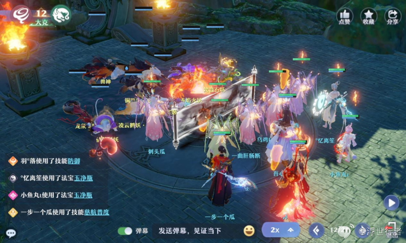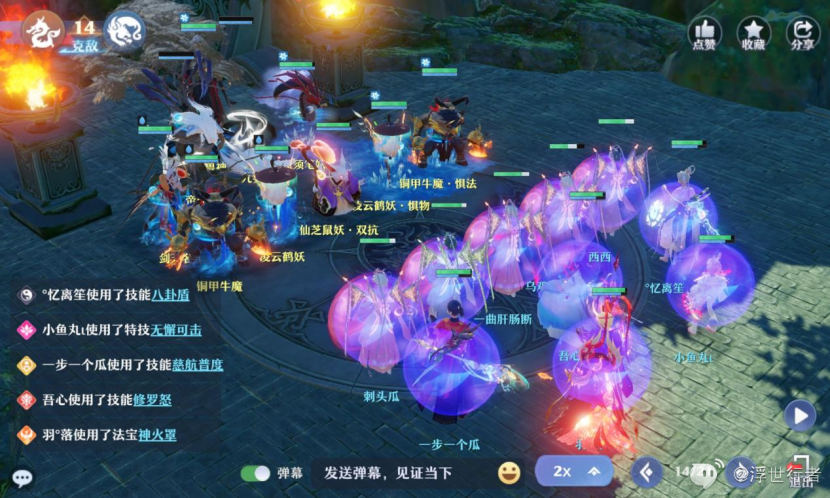 合欢和长生根据战况选择封印,特技或者召唤,奶妈加血或者特技,鬼王无双连斩或者狂鬼,万毒无双连斩或者蜈蚣,如果能确保两回合杀掉的话也可以直接三刀五刀砍,加全部宝宝集火帝休,法师继续守九婴尸体。