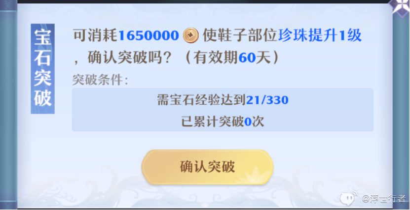 110级每个部位宝石突破需要满足升级经验大于等于330(109级突破要求宝石经验为327)的条件,同时还要额外消耗165万铜钱。6个部位总共需要330*6=1980宝石经验(1980颗1级宝石)。后续每次突破宝石经验要求增加330(每次增加1980颗1级宝石)。
