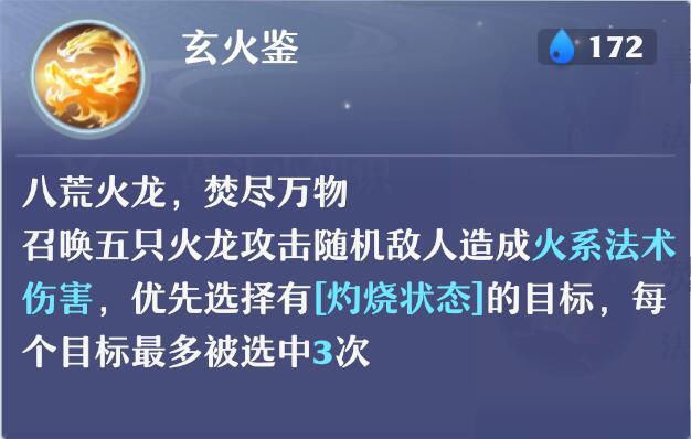 2.玄火鉴:焚香谷的大招,爆发输出技能,召唤5只炎龙攻击敌人,会优先攻击带有灼烧状态的敌人,单个单位最多受到3次伤害。 有分身的情况下,双重玄火十龙飞,不死也残一大堆。