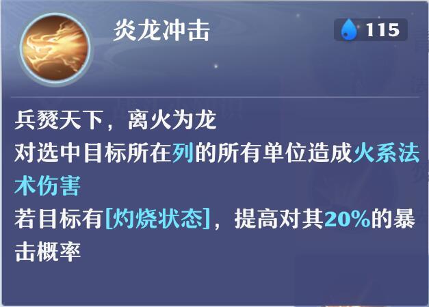 算上分身的炎龙,双龙出海,高暴击的秒5,直接可以杀穿一路。也算是焚香的第二核心输出技能了。 (但是不太稳定,比如技能选中的目标提前死亡倒地,就有可能出现打到一列只有一个目标的情况,但这种情况是可以最大程度上避免的,在释放炎龙冲击的时候,不是必须选该列的第一个目标的,我们可以选择自己要攻击的目标列,选里面最不可能在当前回合倒地的单位,释放即可。)