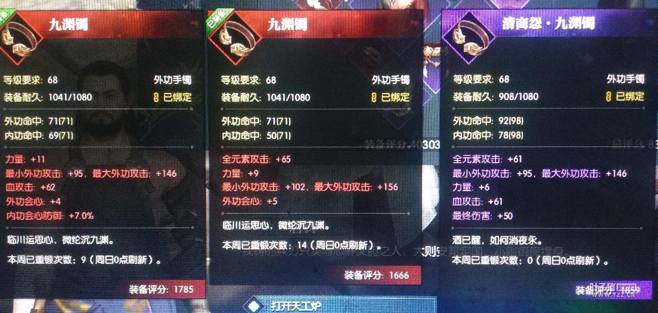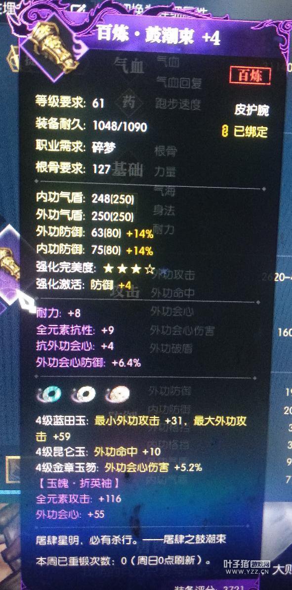 逆水寒装备系统是十分完善的,各种各样的词条和属性,并且影响整件装备的效果属性,大多数玩家都追求大小攻的词条属性,小编倾向于堆元素攻击的。适用于技能中元素伤害加成较高,且攻速快的职业。那么我们如何堆元素呢?快来一起看看吧。 7万分单杀8万分没压力。 经过测算和讨论,有个结论(假设你只有武器套装的一条削金或者两条): 单纯堆外功,收益不会太高; 在有一个力量词条与一个攻击词条后,剩下的词条没必要接着上攻击词条。 想堆元素的玩家了解下如何堆元素,并不难。 以下是个人的装备图,最右边的另外一个比较极限堆元素碎梦的首饰(那种五词条的,平民玩家很难做到,把最终伤害忽视了,按四词条看吧。) 心法: 加上项链的+3,是18级的心法,提供了469点元素攻击。 19级开始,是27点一级。 项链: 自己的项链,没弄,买的成品。提供了80点左右的元素攻击。 平民玩家,但右边的这个,在你的心法点到17级后,项链上+4可以提供108点元素攻击。 其实还可以打一个血元素,一个全元素,元素词条满是67,但考虑到随机性,假设一个词条60点,两个词条一共120点。 那么,项链上打心法+4,一个全元素攻击,一个血攻击,一共可以给你提供228点元素攻击。 手镯: 红色的手镯是小编的,紫色的是另外一位碎梦的。 两个手镯提供了127点元素攻击,紫色的一个就提供了122点。 按紫色的算,两个手镯洗的好点,一共可以提供240点元素攻击。 戒指: 左边和中间的是我的,一共提供了122点元素攻击。 右边那个提供了125点元素攻击,两个起码240点。 护腕精琢: 全部四级石头,精琢3个孔。 是116点元素攻击和55点会心。 834点元素攻击就是这么来的: 469+122+127+116=834。 但这不是极限。 假如你武器没有心法词条,按现在15级心法,项链+4和两条元素词条,其他的首饰两个元素词条算: 496+120+240+240+116=1212。 也许你们会觉得这元素攻击数值低,但请在你们自己的区,找那种也堆元素攻击的,互相测试下pvp时的伤害。 以上就是逆水寒教你如何堆元素攻击,1212点元素不是梦的全部内容。 点击加入叶子猪逆水寒玩家群QQ群:711879579。或者打开微信,扫码添加叶小猪好友,回复“14”,叶小猪将拉你进玩家微信群。 更多逆水寒攻略请关注叶子猪逆水寒专区:http://www.yzz.cn/game/nsh/。 |