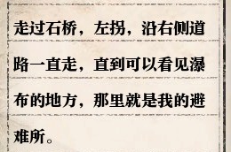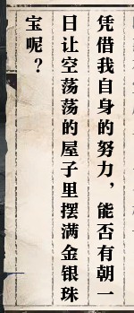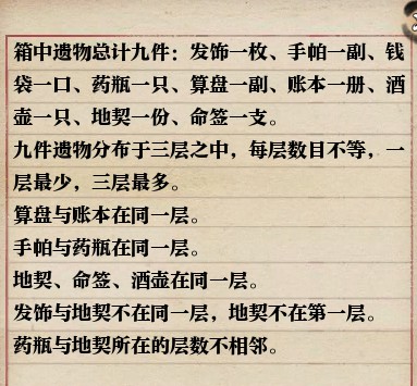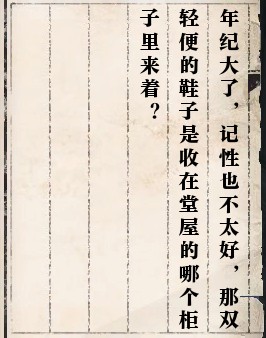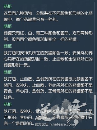 《逆水寒》里有很多的支线任务,有些任务真的非常烧脑,尤其是探索任务,下面为大家带来岁月神偷探索任务攻略。 进剧情触发老头和小孩的对话 小孩走到这里指了一下,开望气,在竹林里(194,142)用风水术找到木剑 任务提示后厨门口,走到这里(132,152)就会有交互键,触发剧情 根据这个提示,我们需要找笔墨和白纸 笔墨和白纸坐标在(161,196),捡完笔墨和白纸,会触发神秘人对话 根据提示,我们需要找到天然的石桌,石凳 坐标在(184,119),走到这里触发剧情 然后根据提示,我们要开始找碎片了 接着我们开着望气在这张图里逛吧,图中的这种光柱,就是我们要找的碎片一共八个碎片 坐标(171,75)、(156,129)、(200,108)、(171,185)、(208,198)、(270,189)、(263,141)、(137,177) 收集齐八个碎片在包裹任务栏里修补合成触发提示 根据提示需要回到那个石桌那里,使用刚才修补好的画,触发剧情,从幻境中出来了 根据剧情里妇人说的话,我们在石桌这里(180,113)开望气,用风水术,拾取任务物品给老头再次进入幻境 提示我们需要找能够乘凉的树 开着望气,在(118,128)可以看到一个蓝色的人躺在树下,走过去触发剧情 根据提示,我们可以开始扫地了,不对,扫落叶 开着望气能看到这种光芒,就是我们要扫的落叶了,一共六处要扫 坐标:(163,135)、(170,154)、(119,141)、(111,122)、(124,116)、(148,116) 扫地结束触发提示 根据这个提示,我们可以回家了 在家门口可以看到一个东张西望的NPC,走过去触发剧情 根据提示我们需要去找避难所啦 石桥在家的正对面 走到(288,200)可以就看见NPC啦 然后就是跟着NPC打木桩,如果没看清可以和NPC对话再看一遍,一共要打5次打完触发提示 然后回家 看到这三个NPC 触发剧情 根据提示,我们要去堂屋的柜子里找剑 在这个柜子(143,168)用望气-风水术,捡起剑 根据提示我们会屋子里能看得到很多宝箱,先开后面的4个小箱子,根据箱子给的提示 第一个箱子是:237 第二个箱子是:504 第三个箱子是:256 第四个箱子是:741 然后是三个银箱子,我门看到图中,有木板交叉,意思是两个小箱子得出的数字相加 第一个箱子是:622 第二个箱子是:508 第三个箱子是:566 最后的金箱子的密码是三个银箱子给出来的数字从左到右排列是242 打开箱子之后触发剧情然后出门捡到带血的手帕,(161,172)获得提示 拿着手帕到水里清洗(手帕在包裹任务栏右键使用) 根据提示,要去找NPC给我们讲故事的地方(179,149),使用手帕,触发剧情 捡起白发 根据提示回到屋子里搞镜子 一定要先点柜子上的蜡烛!然后把镜子下面都转出来光圈,进门左手边台子上有一个不会动的镜子,最后转到所有镜子出光圈,不会动的镜子也要出一个大光圈,然后走进大光圈就可以触发下一步剧情了!PS:因为另一个号还没61级,如果需要,明天补发转镜子图 图补上了,把这几个镜子转对,另外左边两个随便转一转应该就OK了吧,实在是来不及截图 根据提示我们去后厨拿锄头,准备挖 锄头位置(139,168)特别不明显 拿到锄头我们回(217,93)挖海螺,然后使用海螺 这次要用听的!请把声音开到最大 然后回到主厅的旁边的阁楼触发剧情 根据提示去阁楼的柜子里(168,194)使用望气-风水术,找衣服,拿了衣服去给老头 再次回到幻境,会出现5个NPC,忘记截图了,留下中间那个耶律淼不要杀,其他的杀掉,杀错了会重新来过 然后回身拿酒坛获得提示 根据提示我们回厨房放酒坛 然后发现回不去了 正门会出现一个NPC 让你选择,打你肯定是打不死了,下了台子就脱战了,还是老老实实选择委屈求全吧 官方吐槽,最为致命 回到后厨(132,182)使用背包里的酒坛触发剧情 根据提示拿镯子 镯子在(134,173)拿了镯子的到提示 根据提示回卧房 在卧房(阁楼)(173,193)把手镯放柜子里 触发提示,使用包裹任务栏里的拨浪鼓 你脚下会出现一个小孩,跟着小孩跑,消失了再用一下拨浪鼓,一直跑到(267,216) 触发剧情后依次打柱子,然后走到NPC旁边,触发剧情 根据这个提示我们去找笛子,在(245,228)使用望气-风水术,捡到笛子给老头 然后触发剧情,回身后,先拿桌子上的清单 一层是:手帕,药瓶 二层是:发饰,算盘,账本 三层是:地契,命签,酒壶,钱袋 根据提示去修屋顶 屋顶看到NPC,去触发剧情的到提示 去卧房找药 就是这个柜子(156,201) 根据提示清点药物,算出来 跌打酒:红,圆 安神丸:红,方 养心丹:白,方 止血散:白,圆 金疮药:青,圆 正骨膏:青,方 整理完药柜出提示 根据提示去堂屋找鞋子 开望气-风水术,探(156,182),捡了鞋子触发剧情,跟着NPC一路走过去,帮他打心魔 根据提示,去墓碑处(240,148)用望气-风水术,找到佛经,给老头 根据提示开箱子,651 根据提示到(198,186)触发剧情 有小船的那个河边