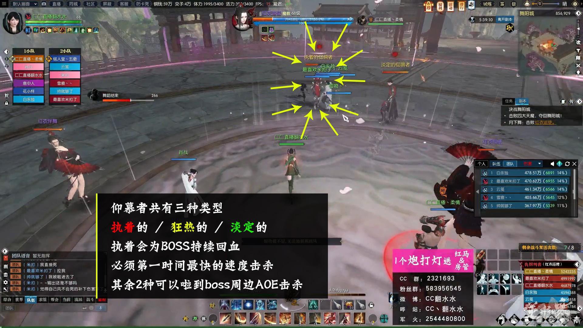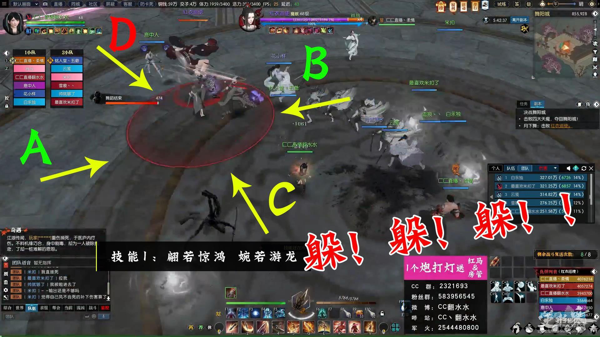 众所周知逆水寒中舞阳城是一个12人本的高难度副本。副本产出百炼令,时装,百炼装备等等,奖励十分丰富。但是同时副本难度也是非常大的,需要团队之间相互配合,今天小编就给大家分享一下通关舞阳城第四关的攻略,希望能帮助大家。 阵容配置: 固定1t,2奶妈:进去跳舞。 近战6个:碎梦(1至3个)、其余血河。 神相2个:放风墙和跳舞。 随意1个:友情位,硬件合格且会跳舞。 接下来是每个队伍成员的硬件要求: 裸最大外功4000以上,加上BUFF后5000以上,命中243还是会出现失手,勉强凑合用。 有了硬件要求还不行。 软件还要达标,也就是操作手法。 如果秒伤不达标那就是手法有问题。 也是不能过关的。 下面进入实践演示: 第一个要注意的是boss的技能一: 翩若惊鸿,宛若游泳。 建议躲这个技能的时候近战要找A点和B点,C点有不确定危险性。D点是最危险的。 然后是技能一从避让到重新进场的时机掌握。 毕竟这个boss的输出时间是分秒必争的。 接下来是boss的技能二: 轻云蔽月,流风回雪。 神相尽量交风墙挡住扇子就行。 最重要的来了。 就是对每一波仰慕者的处理。 看到这个箭头了吗? 这个箭头表达了主播对这个执着的仰慕者的尊敬以及敬仰。 很多队伍明明硬件达标,秒伤也达标。但还是8分钟打不死boss导致团灭。最主要的原因就在于对这个执着的仰慕者处理上不到位。 可能大家知道要第一时间击杀,但是实行的时候并没有在出现后最短时间击杀,导致给boss回到血从而时间不够而团灭。 如果硬件达标,手法没问题,以上细节都处理好了,基本上通关老四也没啥问题了。 以上就是逆水寒如何顺利通关劲舞团老四攻略的全部内容。 |