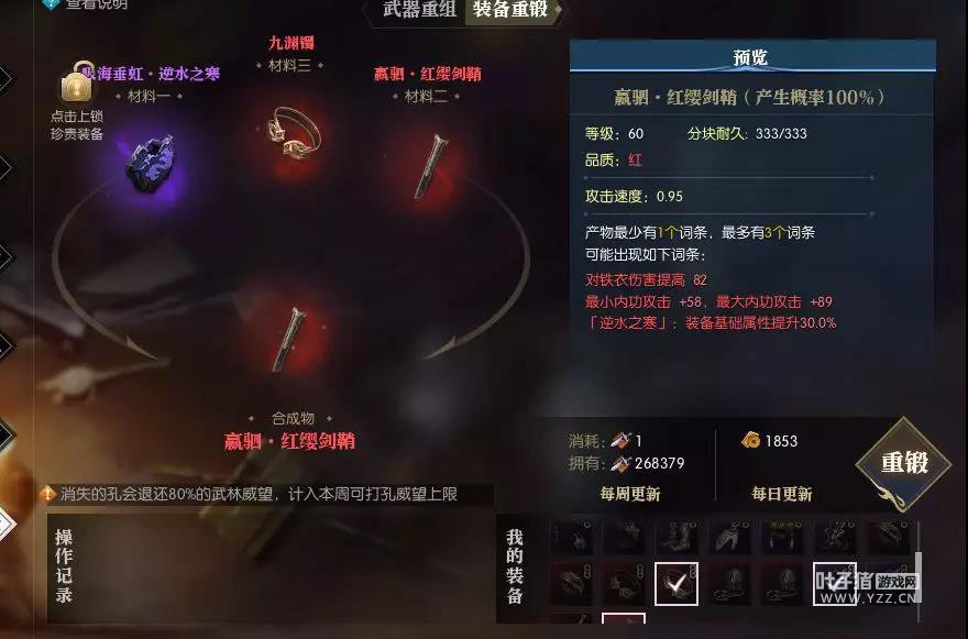 逆水寒最新更新开放了70级百炼无损升级途径,许多小伙伴表达了对于升级道具吸海垂虹的疑惑与不解,吸海垂虹是什么,有什么作用,怎么获得,下面一起跟小编来看看吧。 Q1:什么是“吸海垂虹”? 吸海垂虹,是逆水寒为了简化大家的武器重锻操作,推出的协助大家打造武器分块的物品。以往我们要把稀有词条转移到武器上,需要在唐铸大哥那里进行非常复杂且难以理解的重铸操作,现在通过吸海垂虹,可以直接用带有稀有词条的吸海垂虹去重铸武器分块,最终将自己满意的武器分块合成完整武器即可,简明易懂。 *吸海垂虹可在武林威望武库消耗武林威望购买,每周限购一个。 Q2:吸海垂虹怎么用? 吸海垂虹的使用分为提取阶段与重锻阶段。 提取阶段:右键使用物品“吸海垂虹·空”,包裹中可吸取的装备将会亮起,选择可吸取装备上的某一词条。 点击确定吸取后,该装备会消失,玩家获得一个储备了某个词条的物品:“吸海垂虹·属性”。 *吸海垂虹的使用范围:提取≥60级且红色及以上装备上的稀有词条,以及≥70级且紫色及以上装备上的普通/稀有词条。 *吸海垂虹可提取的稀有词条:逆水之寒、凭风凌绝、断玉、削金、铁骨、纳敏、固防、金汤、厚德、百分比最小内功攻击、百分比最小外功攻击、益气、破空、淬力、开碑。 重锻阶段:放入带有属性的吸海垂虹、狗粮装备、以及充当胚子的武器分块一起重铸。重锻产物将有概率继承“吸海垂虹·属性”上的词条,词条数也有可能变多。 Q3:吸海垂虹重锻时会消耗吗? 下图是重铸结果示意图,只有当玩家选择了合成物时,吸海垂虹才会消耗。如果重铸结果不理想,玩家选择材料一,则仅消耗材料二狗粮,材料一和吸海垂虹均不消耗。 吸海垂虹加入以后,武器重铸就可以摆脱“生殖隔离”、“词条位置上移下移”等等多种晦涩的操作套路了,大家都可以以更简单明确的方法,打造自己心仪的神兵利器。 以上就是逆水寒吸海垂虹有什么作用,吸海垂虹怎么获得的全部内容。 点击加入叶子猪逆水寒玩家群QQ群:711879579。或者打开微信,扫码添加叶小猪好友,回复“14”,叶小猪将拉你进玩家微信群。 更多逆水寒攻略请关注叶子猪逆水寒专区:http://www.yzz.cn/game/nsh/。 |
