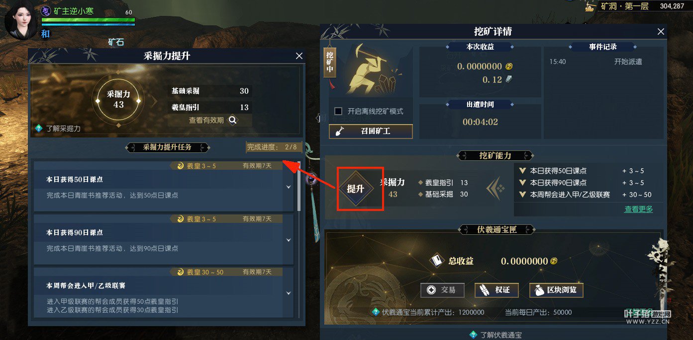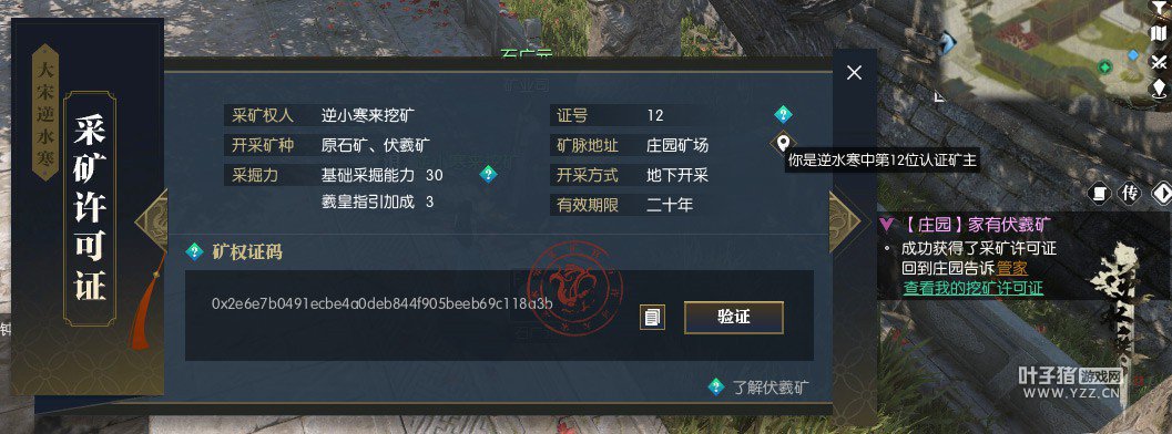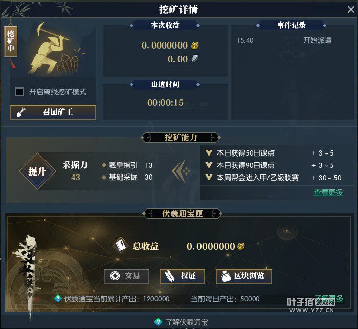 逆水寒开启基于区块链技术的伏羲通宝玩法,开启伏羲通宝挖矿有什么条件?怎么开始挖矿呢?下面小编就给大家介绍一下。 开始采掘:开始大宋矿工生涯 伏羲通宝藏于九州地脉深处,须持有大宋逆水寒的采矿许可证,开设专属的地下矿洞,方可进行地下矿脉的开掘。且由于伏羲通宝埋藏至深,一般需要雇佣和派遣专业的采矿能人(矿工),前往深层矿脉探寻采掘。每次派遣矿工携带的补给最多可出遣48小时,48小时内如果不召回矿工,他也将自动返回。 开启伏羲通宝挖矿的条件 1.角色等级≥60级(不需要学习生活技能采矿); 2.拥有自己的庄园; 3.完成庄园系列的前置任务-庄园订单任务。 满足条件后,即可在庄园管家处接到引导任务-庄园家有矿场。 与管家对话接取任务:近些时日,庄园市场中出现了一批兑换地下矿原石的资源订单,管家建议你去申办一张采矿许可证,以在庄园中开设一个地下矿场,以满足资源订单之需。 第一步:庄园矿场达到3级以上。 开设矿场,需要将庄园的矿场建筑升到3级以上。 第二步:前往汴京找矿业司办理采矿许可证。 矿场等级达到3级的要求后,即可带着管家为你准备的申办文书,前往汴京找矿业司办理采矿许可证。 第三步:向石广元了解伏羲通宝。 交谈中,矿业司提到了最近的伏羲通宝热潮,向矿业司打听下什么是伏羲通宝,在此可以了解一些伏羲通宝的由来和大体情况。 第四步:签字确认办理采矿许可证(绑定区块链账号地址)。 一番介绍后,矿业司签发了你的采矿许可证,需要你签字确认。签字成功后,即可获得一张采矿许可证,同时获得一个绑定的矿权编号(即区块链账号地址)。 注意,每个游戏账号只能绑定一个区块链地址,该地址即代表你在逆水寒区块链上的账号,可用于在逆水寒区块浏览器上查证你的挖矿权益和交易记录。 第五步:回到庄园,进入地下矿场。 回到庄园,与管家、产业管事进行交谈,确认一些矿场的筹备事宜后,即可通过矿场建筑进入到地下矿场中了(进入方式:在矿场建筑中央,按F键即可进入矿洞)。 第六步:向矿业总管了解地下矿场和挖矿之事。 在地下矿洞中找到矿业总管,与之交谈可以了解一些关于矿场和派遣矿工挖矿的问题。 第七步:尝试派遣矿工开始挖矿。 初步了解之后,即可开始尝试派遣你的矿工进行挖矿了。操作方式:在游戏界面右上角,点击下图图标即可打开挖矿界面,进行矿工的派遣和召回。同时,你可以在该界面查看您的挖矿收益、总的伏羲通宝数量、采矿许可证,以及后续的伏羲通宝交易和区块浏览功能。 注意:采矿过程为完全自动,玩家只需要派遣或召回矿工即可,不需要亲身挖矿。且挖矿过程中不会增加玩家电脑的运算负荷,简单地说就是和正常玩游戏没有区别。 第八步:了解并尝试提升采掘能力。 进一步向矿业总管了解挖掘伏羲通宝的注意事项,以及学习如何提升采掘能力(提升算力)。 注意,提升采掘能力可以提高你的挖矿效率。江湖上每天都有众多的挖矿者在同时与您竞争有限的伏羲通宝。更高的采掘能力,意味着在同一时段内,您有更高的竞争力,可以获得相对更多数量的伏羲通宝。 操作方式:点击挖矿界面里的提升按钮,可以查看有哪些任务可以提升你的挖矿能力,并尝试完成这些任务来获得采掘能力的提升。 至此,伏羲通宝挖掘的引导流程已基本完成,后续可以通过打开界面右上角的按钮,打开挖矿详情界面进行挖矿和伏羲通宝管理,或者可以在矿洞中找矿业总管进行操作。 如何获得更多的伏羲通宝: 你的采掘能力影响你的矿工挖掘伏羲通宝的效率。采掘能力越高,可以雇佣的矿工数量越多,在同一时段内您的矿工所采掘的伏羲通宝数量会相对越多。采掘时间越长,累积可获得伏羲通宝越多。 每天的50000枚伏羲通宝,将在每天的24小时内,根据每天的各时段的历史在线情况,按时段进行自动分配。 而在单个时段内,您所能获得的伏羲通宝=当前时段可被采掘的数量*您的采掘力/所有进行挖矿玩家的采掘力总和。 提升挖矿能力 采掘力分为两种,基础采掘力和作为加成的羲皇指引力。获得采矿许证证时,你即可拥有30点永久的基础采掘力,基础采掘力可以持续生效。后续您还可以通过在江湖中的各种事件和活动中,获得加成的羲皇指引力,提高你的矿工挖掘伏羲通宝的能力。羲皇指引力具有一定的时效性,超过期限后将不再生效。 当前在游戏中,可以通过每日登录、完成日课点、提升庄园等级、帮助自己的帮会进入甲、乙级联赛等来获得基础采掘力或羲皇指引力的提升。 以上就是逆水寒伏羲通宝开采,如何更多的获得开采矿介绍的全部内容。 点击加入叶子猪逆水寒玩家群QQ群:711879579。或者打开微信,扫码添加叶小猪好友,回复“14”,叶小猪将拉你进玩家微信群。 更多逆水寒攻略请关注叶子猪逆水寒专区:http://www.yzz.cn/game/nsh/。 |