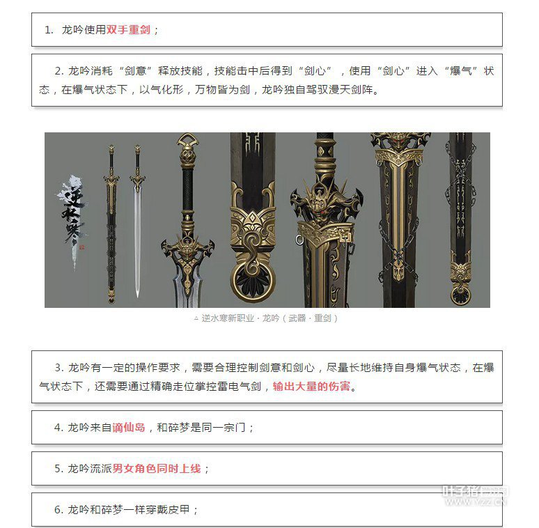 逆水寒的新流派龙吟就要上线了,新职业龙吟在玩家中呼声极高,今天在对龙吟的预告中,官方说出了两个版本,到底是怎么回事呢?快来和小编一起看看吧。 逆水寒这次又搞了一波骚操作,在微博和微信分别介绍了龙吟的两个形态: 龙吟分为双手重剑和单手长剑两个形态,其中双手重剑为伤害输出型流派,具体如下图。 而单手长剑则为辅助治疗型流派,可以治疗和提供BUFF,具体如下图: 从描述来看,龙吟有两种武器,那么很有可能需要切换形态,而不是如同素问的输出和治疗只是技能选择问题。 以上就是逆水寒龙吟轻重剑双形态来袭,输出还是治疗?的全部内容。 点击加入叶子猪逆水寒玩家群QQ群:711879579。或者打开微信,扫码添加叶小猪好友,回复“14”,叶小猪将拉你进玩家微信群。 更多逆水寒攻略请关注叶子猪逆水寒专区:http://www.yzz.cn/game/nsh/。 |