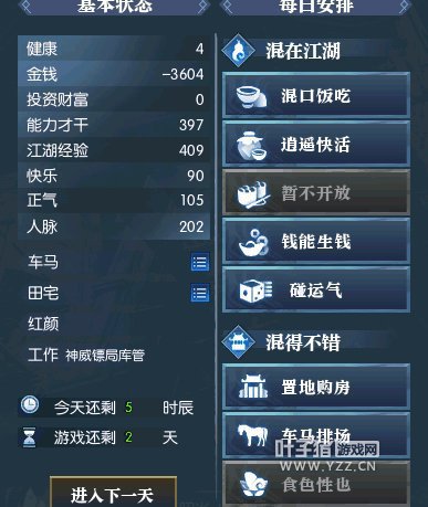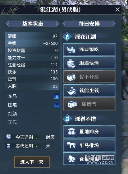 逆水寒中混江湖是集成的一个小游戏,要求游戏玩家在10天内(游戏时间),通过自己的健康、金钱、能力才干、江湖经验、快乐、正气、人脉等属性值,来获取高等级的车马、田宅、红颜,最后系统根据你的获取的物品情况进行总体评分,同样的,混江湖也是需要欧气的,下面一起来跟小编看看吧。 加入有领地的帮会,并且角色≥55级以后,就可以领取任务,顺利完成任务后,可以根据结局评分选择经验、金钱、帮会贡献其中一个作为任务奖励,结局评分越高奖励约好。 大佬的混江湖: 当然偶尔也有失手混江湖: 小编前几天也去试了试混江湖任务,然而到了最后一天的时候没注意健康值,结果就挂了,前面的努力付之东流,所以混江湖不仅需要运气,小伙伴们还要注意自己的健康值哦。 以上就是逆水寒欧气满满还是濒临死亡?跌宕起伏的混江湖分享的全部内容。 点击加入叶子猪逆水寒玩家群QQ群:711879579。或者打开微信,扫码添加叶小猪好友,回复“14”,叶小猪将拉你进玩家微信群。 更多逆水寒攻略请关注叶子猪逆水寒专区:http://www.yzz.cn/game/nsh/。 |