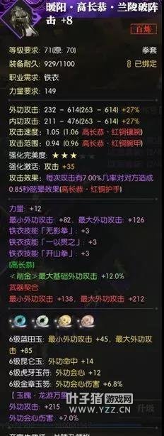 3、武器的选择 如果你已经做好了4攻武器或者双攻双沉舟的武器,并且短时间内不考虑更好的词条,可以继续使用。楼主的武器就从双攻双沉舟更换成了双攻三技能的武器(浮大亏还以为我在做项链胚子),配件如果没有1.03攻速以上的邓禹(马媛)请选择高长恭(张飞),范围套不适合做输出。有没有攻速直接决定你的怒气获取量,怒气是强化铁衣技能资源,战斗资源获取的越多,效率越快铁衣的输出就越高!在精啄孔方面,楼主因为换了武器没法开5孔,选择了4孔4精,增加了会伤,这就是楼主没有开碑170会伤的由来。