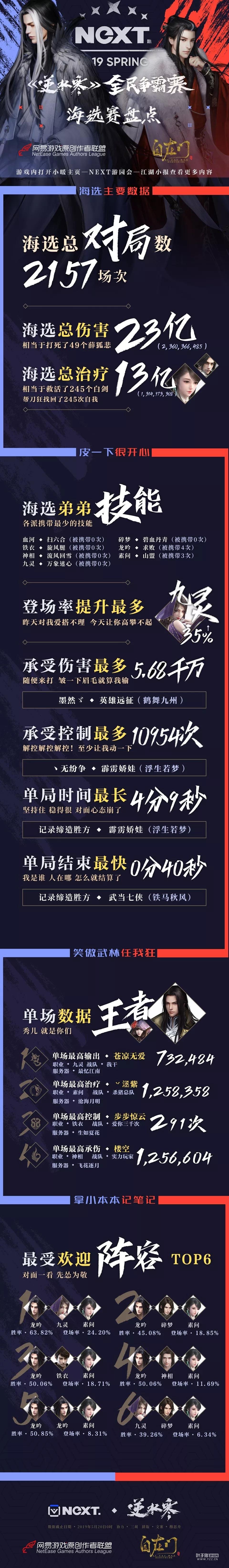《逆水寒》全民争霸赛正在火热进行中,截至目前海选赛已经告一段落啦!比赛中也产生了许多令人震撼的数据,比如上亿级别的伤害与治疗,更有“九灵”流派以35%的登场率提升实现了一次小逆袭,吸引了吃瓜群众的目光。事不宜迟,让我们来仔细品一品详细赛事数据盘点吧~