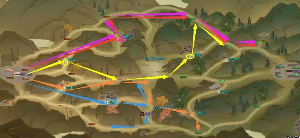 图解江畔寻花帮战起手式——七杀提供 关于中后期的策略,七杀给逆小寒回忆了跟醉酒折花的决赛中,他们打出的一套围点打援的局。 “我们派出3个团,以主力强攻的姿态去攻略对方的中路,当对方防守力量抵达现场后,我们就一直跟他们进行拉扯。 “过程中,我们佯装打得很吃力,实际要求则是不完全吃掉这支防守力量,逼迫他们喊支援。 “很快,我们斥候发现对方两个团的援军按奈不住选择了出击。于是,我们开始且战且退,希望让对方相信,只要援军一到,一定能吃掉我们。 “当对方援军赶到后,我们已经把交手地点拉到了河道,让他们失去了塔的地形优势。同时,我们隐藏的最后一个团也赶到现场。表面上形成了4团VS.4团的大决战阵势。”