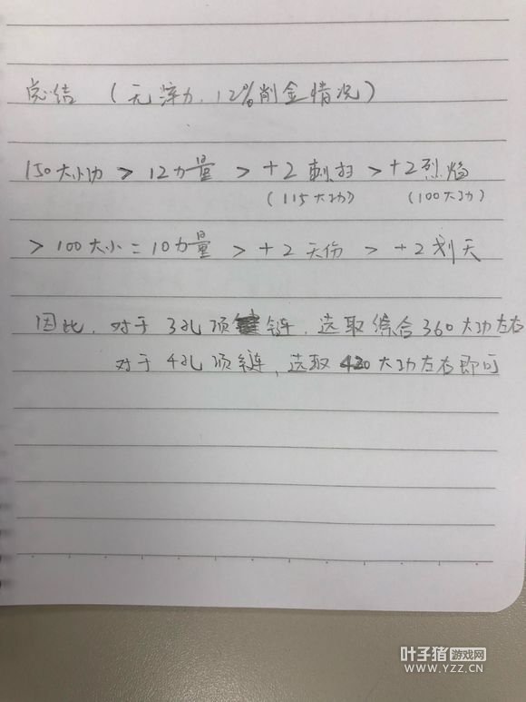 逆水寒中血河攻击范围大 ,爆发力中,持续攻击力强,机动性强。很多玩家因其选择血河,现在很多玩家已经有了自己心仪的武器了,那么对于项链的选择,很多玩家比较迷茫。今天小编给大家分享一下血河项链选择。希望能帮助大家。 所有数据皆无BUF数据,平民基础属性,若是4削金2逆水大佬,表示无法计算。 对比之前的算法,红莲一级1100,基础30000,比例20%,大小攻转换1.25,4900大攻,提升1.8%,约为90左右大攻,+2情况下。 铁画一级370,基础12000,比例20%,大小攻转换1.25,4900大攻,提升1.5%,约为75左右大攻,+2情况下。 总的结论,最后回几点: 1.你要是20级刺,其他都8级,就别问了。 2.手法自己选,都不差,看习惯。 3.算法是按照舞阳城5,6boss多次数据取平均,刺扫26%,红莲铁画20%,手法不同不一样。 4.算法是按照输出占比,即100W的输出中,刺26W,红莲20W,因此不需要考虑打了几次刺,几次红莲,是否卡屏,是否掉帧,而且为实战数据,比较有说服力。 以上就是逆水寒血河介绍,最实用的项链技能选择介绍的全部内容。 点击加入叶子猪逆水寒玩家群QQ群:711879579。或者打开微信,扫码添加叶小猪好友,回复“14”,叶小猪将拉你进玩家微信群。 更多逆水寒攻略请关注叶子猪逆水寒专区:http://www.yzz.cn/game/nsh/。 |