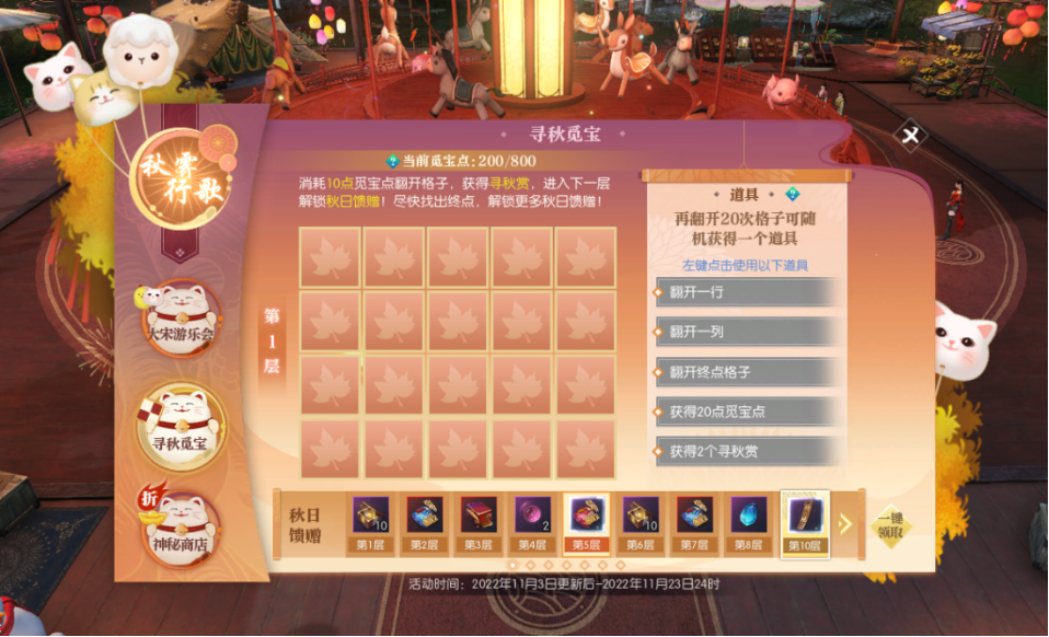 为了保证服务器的运行稳定和服务质量,《逆水寒》将于2022年11月3日早8时停机进行维护工作,预计维护到上午10时。 本次更新结束后,游戏客户端版本将升为22-11-02-02-00,更新客户端后可进入游戏。对于停机期间给少侠带来的不便,敬请见谅,网易游戏感谢大家的支持和配合。 ★新一轮转服活动开启,高级万能英雄帖再次发售! 1.高级万能英雄帖: 1)在转服时使用高级万能英雄帖可以忽略转服间隔时间转入任意服务器(只能转入符合转入条件的服务器,如未开放转服的服务器依然不能转入),可以在使用普通转服英雄帖后立刻使用。 2)转服活动开启后,会先竞拍普通英雄帖,再竞拍高级万能英雄帖,普通英雄帖竞拍的全服成交价格的最大值将作为高级万能英雄帖竞拍的起价。 2.本期转服活动日程: 1)转服活动开启时间:11月3日12时-11月10日更新维护前(持续约一周)。 2)普通英雄帖竞拍时间:11月3日12时-11月3日22时(持续10小时)。 3)高级万能英雄帖竞拍时间:11月4日12时-11月4日22时(持续10小时),仅发售20张,将由所有服务器共同参与竞拍。 3.若在一个服务器同时竞拍到普通英雄帖和高级万能英雄帖,使用普通英雄帖转服后,再使用高级万能英雄帖转服将无法获得【转服新生帮会红包】。 4.同时拥有高级万能英雄帖和普通英雄帖的同门,推荐优先使用普通英雄帖。 ★【盛夏光年】服务器开放赛季服转服! 1.赛季转服时间安排: 1)11月3日10时开启赛季服转服报名,报名开启后,≥69级同门可在目标服务器中报名自己心仪的服务器。 2)11月5日22时报名截止,按照赛季积分排名发放转服帖,同时开启转服。 3)11月6日12时-11月10日0时可以进行赛季转服候补,在报名阶段中名额未满的目标服务器,剩余名额会开放给未报名和报名失败的≥69级同门,先到先得。 4)11月10日8时转服截止,转服帖失效。 2.本次转服的赛季积分 = 玩家历史最高总评 + 5 * 侠影录江湖威名 3.本次【盛夏光年】服务器可转往【雷霆觉醒】、【金羽良缘】、【雷动九天】、【荒海羽梦】4个服务器,每个赛季服转往各经典服均为100个转入名额。 4.第一次报名或候补时均需要消耗500非绑定元宝作为押金,若未获得转服资格,或成功使用转服帖进行赛季转服,则押金全额返还;未使用获得的转服帖进行赛季转服,或使用普通/万能转服帖先行转服的角色,押金将不予返还。 5.转入目标服务器后若有转服合服补领项目,将获得5折的永久优惠(特惠补领为折上折)。 1.“宝藏丰收季”系列活动【秋霁行歌】开启:深秋已至,寻宝大宋! 【秋霁行歌】系列活动将于11月3日更新后~11月23日24时期间盛大开启,共包含3项内容,等级≥40级的同门可在游戏主界面上方【秋霁行歌】按钮处查看和参与。 1)【大宋游乐会】惊喜返场: a)活动期间各项游乐团玩法全天候开启,包括多人匹配玩法(【躲猫猫】、【摇摇乐竞速】)、单人玩法(【爱糖小童】、【猴患无穷】、【瀛洲迷局】、【雪人保卫战】)以及旋转木马。 b)参与方式: 【躲猫猫】和【摇摇乐竞速】可直接点击玩法页面【匹配】按钮参与匹配,【躲猫猫】支持单人和双人组队参与,【摇摇乐竞速】支持单人和1-6人组队参与。 单人玩法和旋转木马可点击【前往场地】前往位于杭州的游乐团场地,与玩法接引人对话参与。 c)参与以上玩法可获得【游乐行歌赏】奖励(内含【游乐币】,并有概率开出【觅宝券】)。 【游乐币】可用于兑换【游乐会惊喜盲盒】、专属系列背部挂饰【浣熊小红】、【浣熊小绿】、【浣熊小蓝】(集齐全部3款浣熊挂饰,更可解锁隐藏款背部挂饰【熊猫天宝】),以及【神秘商店刷新令】、【游乐会交子自选袋】、【轻罗扇】、【觅宝券】等各式奖励。【游乐会惊喜盲盒】使用后可随机获得未拥有的以下时装之一:夜流金、宴神都、玉笙寒、清平调、醉花阴、望江月、梦浮生。若全部拥有,则获得880元宝时装抵扣券。 【觅宝券】可用于参与【寻秋觅宝】玩法,详见下文。 d)游乐会期间将开启【躲猫猫】、【摇摇乐竞速】、【爱糖小童】、【猴患无穷】、【瀛洲迷局】、【雪人保卫战】的玩法排行榜,大宋游乐会结束后,各排行榜前100名可获得玩法限定永久称号。 2)【寻秋觅宝】玩法开启: a)活动期间在玩法界面消耗觅宝点翻开地图格子,可以遇到各种有趣的随机事件。寻觅地图终点并进入下一层,即可解锁本层的通关奖励【秋日馈赠】。 b)通过参与大宋游乐会中各类玩法、战场玩法、每日签到、日课点奖励、【游乐币】兑换几种途径,可以获得【觅宝券】,使用后获得觅宝点。 c)随着玩法层数的提高,可逐步解锁【绝技残页】、【纳地玉笏】、【承天外观自选匣】、【修气飞仙丸】、【寒山石】、交子、绝学点等丰厚奖励,以及纪念称号【凉秋欢游木马轻】、背部挂饰【柿柿如意】、庄园组件【风物灯·驼驼】、【座屏·游乐】等外观奖励。此外,每翻开一个地图格子,都可获得至少一份【寻秋赏】,使用后可获得交子、自在点和技能经验。 3)【神秘商店】折扣来袭: a)活动期间在玩法界面打开神秘商店界面即可抽取一次4-6折的专属优惠折扣,并以该折扣在神秘商店中选购随机时装和技能外观、【2680元宝时装抵扣券】(有效期30天)、绑定【珍稀外观兑换券】、【风华霓裳染】、【迷天残页】,还可使用交子购买【百炼神兵箱】、【承天/纳地玉笏】和【绝技残页】等道具! b)商店