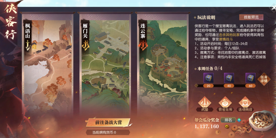 跨服野外,激战逃生 小寒可以自豪地说,任何当下最好玩最流行的玩法您都能在逆水寒玩到!武侠吃鸡,我们有决战浮舟岛!武侠自走棋,我们有豪侠战棋! 在9月新资料片中,江湖首个武侠“塔科夫”玩法【侠客行】正式上线全服! 基于“塔科夫”玩法的“撤离”、“搜宝交易”等核心玩法机制,辅以逆水寒流派特色,首次打通跨服野外激战,一场前所未有的战斗风暴正在袭来! 三大野外地图同时开启平行时空,您可以组成六人小队,万人同屏对决,发挥谋略与战力,逃出生天赢得最终胜利! 研发界面示意图,实际以上线为准 他逃他追,究竟谁插翅难飞?三大地图危机四伏,是搜集到少量宝物就利用撤离点安全撤离?还是大战四方,击败敌手掠夺他人资源?一切全凭各位本事! 在刺激的对决中,同门还可体验全新局内身份,战出千姿百态!一边搜宝撤离,一边收集身份道具碎片觉醒身份技能,化身卦象师、豪商、悍将等独特局内身份;击败随机出现的BOSS,还有机会变身首领,成为人人闻之色变的大魔王! 更有各类特殊事件随机触发,生死系于一线,能否逆天改命全由您定! /联赛史诗级迭代/