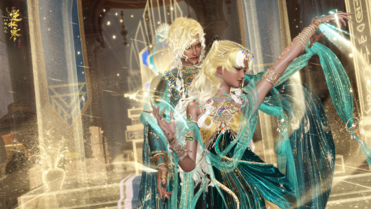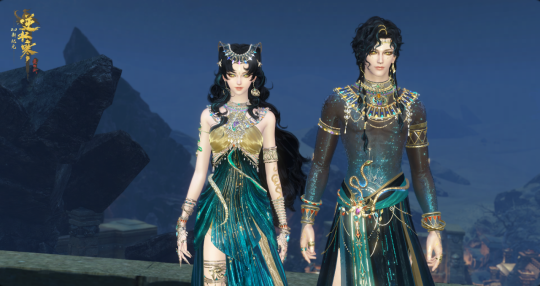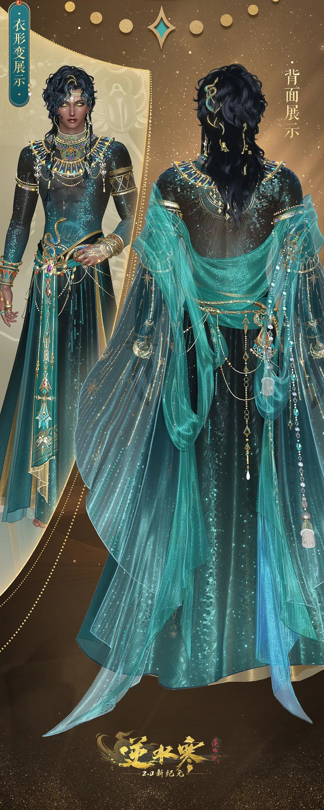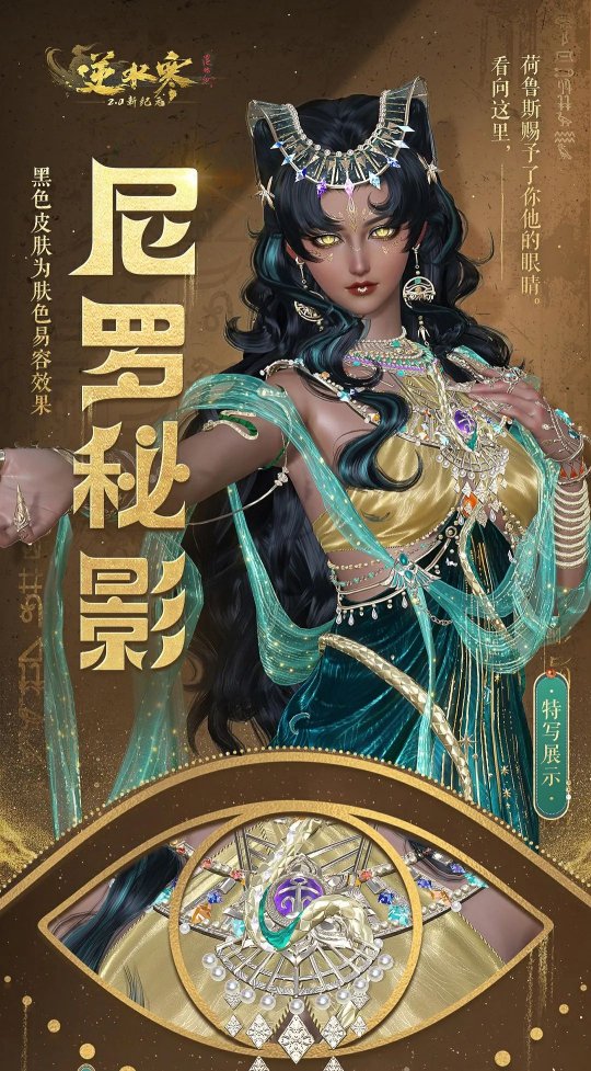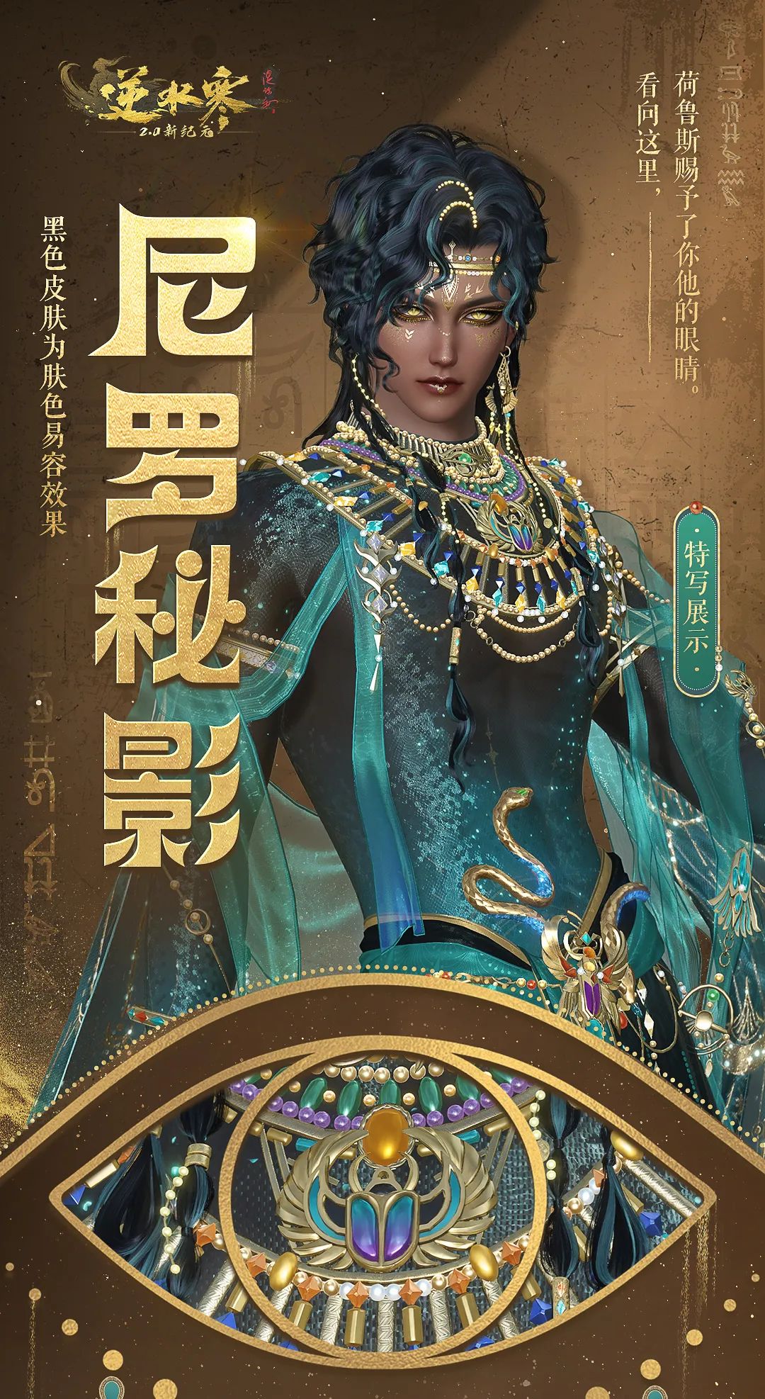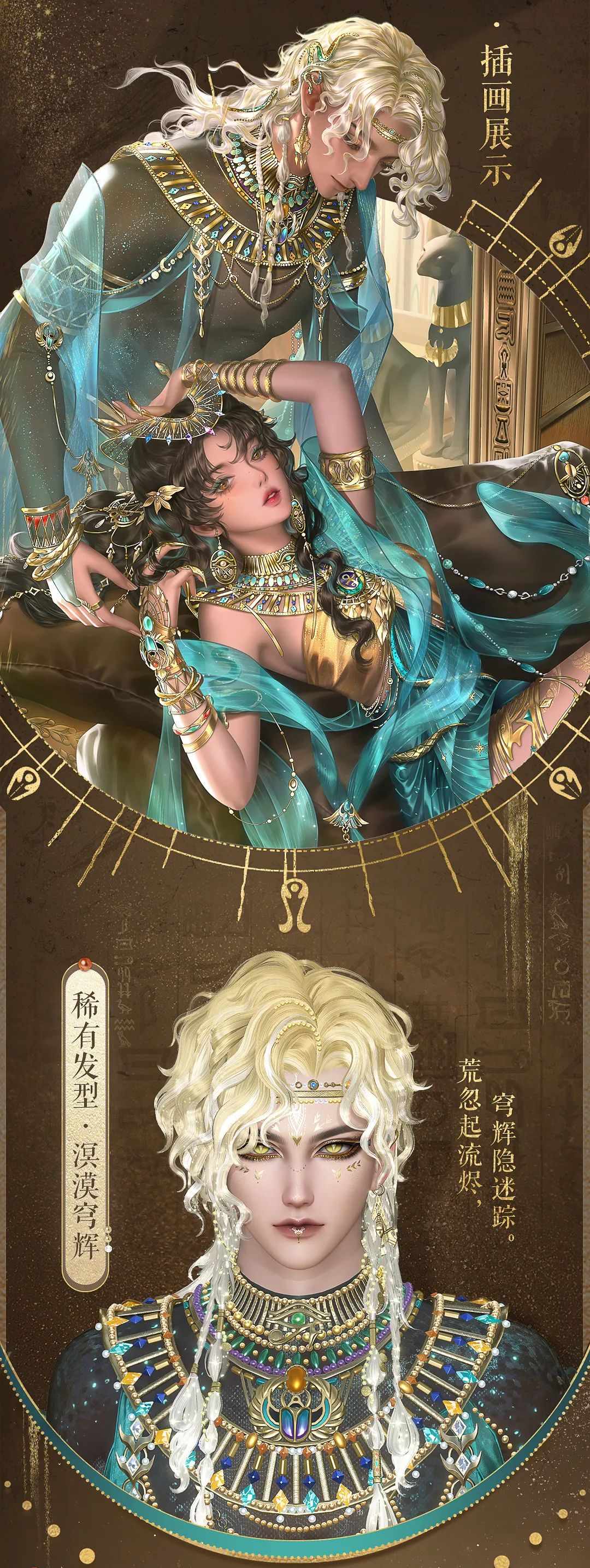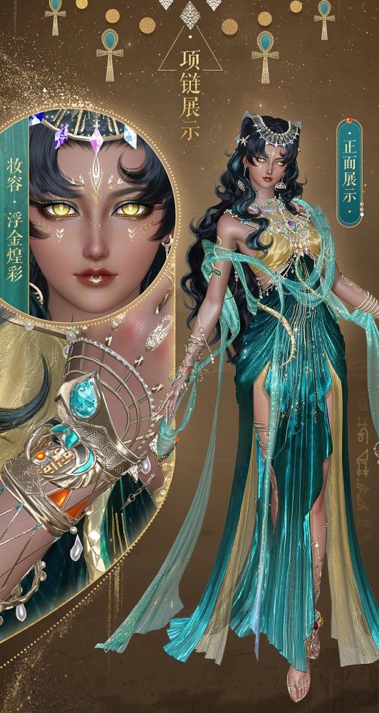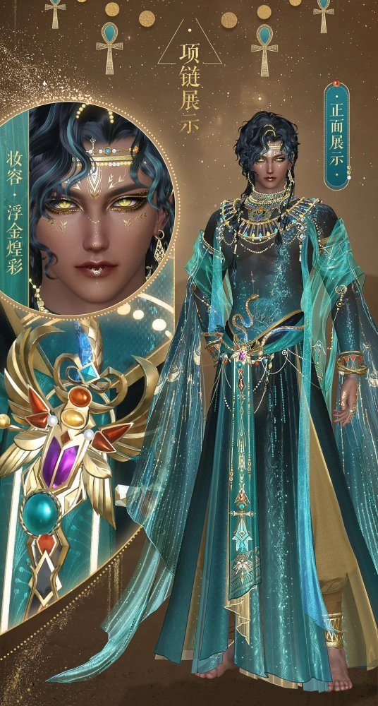 古埃及异域主题外观 看向这里,荷鲁斯赐予了你他的眼睛。时装【尼罗秘影】以古埃及为灵感,宛若荷鲁斯之眼穿越时空的凝视。 蓝绿长袍和金色线条的碰撞,展现着王者的辉煌与神圣。极繁极美,极奢极盛,仿佛一个咒语,让人瞬间感受到来自远古的呼唤与力量守护。 黑色皮肤为肤色易容效果 女装仿若古埃及王室的瑰宝重现,蓝金交织间流露出无尽的庄严与奢华。身上的宝石和金饰如日光耀眼,手臂上纹路勾勒出神秘图腾,仿佛是尼罗河畔最动人的传说。 男装的深绿色更为突出,金丝穿梭其间,金饰熠熠生辉,如同尼罗河畔的金色夕阳洒落沙丘。隐约可见的肌肉线条,透露着对至上力量的崇尚。让人瞬间穿越时空,看到了古老文明的神秘与深邃。 你还可以通过衣形变去掉手臂上的轻纱,曼妙身姿和魁梧身形更突出亮眼! 时装【尼罗秘影】支持自由染色,也许你见到的幻境里,会有不同颜色的风景,那就把它们留在衣衫上吧! 旧事长似梦,尘沙落如星。时装自带动作【尘沙回声】,似梦幻影中猫灵化形,邀你坐上王座,去千年前的神秘宫殿中走一遭。 同时,获得时装【尼罗秘影】还可免费解锁同名头像,成为行走的美丽代名词! 妆容·浮金煌彩