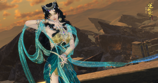 古埃及异域主题外观 同系列妆容【浮金煌彩】更是把古埃及风情展现的淋漓尽致。金色的花钿,中心的一线碧色仿佛凝视着你。金黄的瞳孔和唇中一点金,好似不落的骄阳。 黑色皮肤为肤色易容效果 本周四(9月12日)更新后,古埃及异域主题时装【尼罗秘影礼盒】将以2880元宝的价格上架全服艮岳奇珍,可使用折扣券,以超值价格将上述外观全部拿下。 同时,单品时装、配套黑发、妆容也将分别上架全服艮岳奇珍,可使用折扣券或抵扣券选购,轻松收获同款美貌。 稀有发型·溟漠穹辉