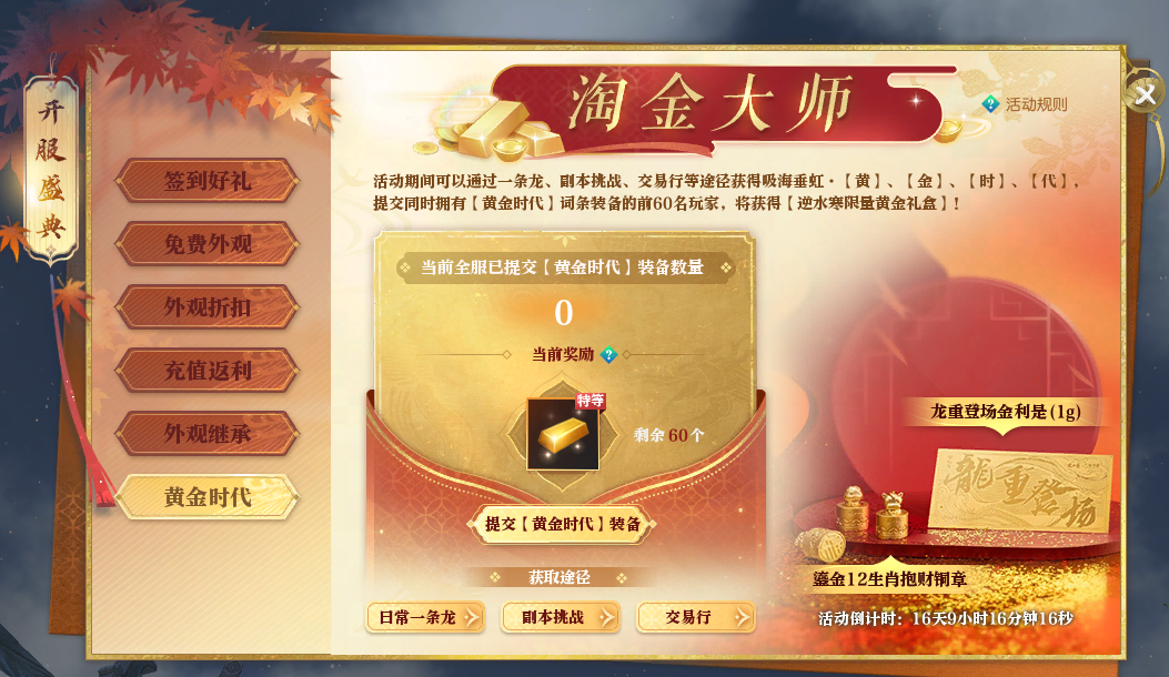 各位自在同门: 为了保证服务器的运行稳定和服务质量,《逆水寒》将于2025年1月9日早8时停机进行维护工作,预计维护到上午10时。 指引: 第一页全服大事件 第二页正式服公告 第三页赛季服公告 全服大事件 ★《新逆水寒:黄金时代》将于1月10日(本周五)14时开启:重回网游黄金时代! 1月10日(本周五)14时将开启5组黄金服:【新·紫禁之巅】、【新·群龙之首】、【新·江山如画】、【新·烟雨江南】、【新·一蓑烟雨】。 1、 庆黄金服开放:黄金武器外观、黄金铠甲免费送!全服同享! 1) 在黄金服累计签到即可免费获得黄金系列武器皮肤【金刚断灭】,黄金铠甲时装【玄华曜金】。进一步可通过每日惊喜宝箱获取材料解锁黄金武器最终形态【金刚断灭·曜】。 2) 1月10日下午14时后,正式服/赛季服同门可通过福利邮件获取黄金系列武器皮肤【金刚断灭】,黄金铠甲时装【玄华曜金】,进一步可通过完成日课点/每日悬赏获取材料解锁黄金武器最终形态【金刚断灭·曜】。 2、 历史充值首次返利,珍稀外观免费开到爽! 1) 1月10日开服后,登录黄金服任意服务器,将根据网易通行证账号历史充值,领取一定数量的【黄金时代宝箱】,抽取包含【溟鲲汐夜】、【汐梦狸】在内的珍稀外观和祥瑞坐骑。 2) 具体账号返利数额及规则可前往官网相关链接查询。 3、 重回开服盛世,18年全年外观零元购! 1) 本次更新后,各位同门可前往艮岳奇珍-黄金时代页面免费兑换18年全年商城外观。若已拥有对应的外观,则在兑换时可获得相应价值的【黄金时代宝箱】。 a) 正式服/赛季服同门开启【黄金时代宝箱】有机会直接获得【浮霄点雪】、【明翼圣昀】等珍稀外观,也可获得数量不等的【黄金碎片】。 b) 【黄金碎片】可用于在黄金兑换商店中兑换各类珍稀外观。 4、 外观继承全面升级,带着衣柜征战黄金服! 1) 7+1史无前例外观继承:黄金服角色可绑定正式服/赛季服角色进行外观继承,可在时装、稀有发型、坐骑祥瑞、武器皮肤、环身、脚印、饰品七大部位各选一件继承,同时在所有可继承外观中再选1件任意外观继承。 2) 暖心外观同门自由选:即使正式服赛季服暂无外观的同门,也可绑定老服角色后选择暖心外观继承。比如祥瑞【玉生烟】、两仪太极系列武器皮肤、六周年纪念红发【流虹/舞鸿】等。 5、 新区赚币老区花,体验黄金服领丰厚奖励。 1) 鎏金时代活动开启,各位同门体验黄金服时,可绑定同账号下任意正式服/.赛季服角色,即可为老服角色赚取最高150张珍稀外观兑换券! a) 正式服也可选择用赚取的鎏金币兑换圣玉,好礼拿到手软! 6、 金砖遍地,喜迎全民黄金时代,【黄金礼盒】限时大放送! 1) 活动规则:黄金服正式上线后的14天内,参与日常一条龙、副本挑战等玩法就有概率获得非绑的【黄金时代】限量版吸海垂虹道具,通过装备重锻获得任意一件四词条且词条顺序为【黄】、【金】、【时】、【代】的装备即可在【开服盛典-黄金时代】界面中提交 2) 活动奖励: a) 前60名提交的角色可获得【金砖】道具,使用后即可获得【逆水寒限量实体黄金礼盒】(在填写联系方式后的30个工作日内寄出)。 b) 后续提交的角色可获得【2880绑定元宝券】,使用后可获得2880绑定元宝,轻松畅享外观豪礼。 c) 本次活动期间,每名角色仅可提交获得一次奖励。 ★ 全新单机式体验玩法【武林旧事·戚少商】全服上线! 七年之前,龙吟流派的青年翘楚戚少商为何拿起沧澜的尺阙?神秘莫测的蛊医为何云游四海?在天羲遗城找到蛊医洛九言,听她将往事缓缓道来…… 1、 参与方式:资料片更新后,≥50级的同门可在【福利】界面的【武林旧事】分页领取任务寻路前往,亦可在【任务-山雨欲来-武林旧事】中接取,玩法将永久开放。 2、 玩法介绍: 1) 【武林旧事·戚少商】副本可以单人选择【戚少商】或【洛九言】任一角色进行体验,亦可以与好友双人组队分别扮演二人共同体验 2) 该副本分为【普通模式】与【快速模式】,普通模式下会体验全部流程,当通关一次普通模式后,可以选择快速模式跳过关卡流程直接重复挑战最终首领。 3) 该副本首次开启全局光照功能,进入副本后可按ESC进入【系统设置】-【画面设置】手动选择画质与全局光照效果质量(推荐高配置机型手动开启) 4) 副本不可存档,请体验完成后再退出副本 3、 通关奖励 1) 通关副本并完成任务后即可获得青铜狼祥瑞·祀苍云、专属个人名片、专属休闲动作、珍稀外观兑换券以及养成材料等大量奖励! 2) 双人组队通关还可完成特殊成就,并获得青铜鸟跟宠·金翎,珍稀外观兑换券,时装半价券等奖励! 3) 若完成【无伤击败boss】成就可领取专属于战斗大师的称号,来表达对各位玩家操作的最高认可。 ★ 典藏时装限量发售,狐狸祥瑞买一“得”四! 1、 “缃绮裁罗锦,狸尾曳若云。” 更新后,山海经系列时装【云狸缃华】上线。 1) 时装【云狸缃华】与配套发型均支持衣形变。 2)时装【云狸缃华】支持自由染色。 3) “碎星聆愿语,闲梦伴雪狸。” 时装自带单人表情动作【狸梦星语】。 4) “悠空云隐,狸梦栖林。” 时装附赠肩饰【悠梦云狸】。 5)集齐本期限定/典藏时装可获得称号【灵璧观奇谭】。 6) “琉金毓华,浅璧眠春。”稀有发型【琉华浅璧】梦幻上线。 7) 发型【琉华浅璧】支持衣形变。 8)解锁发型【琉华浅璧】后,将获得对应头像及立绘。 9) “