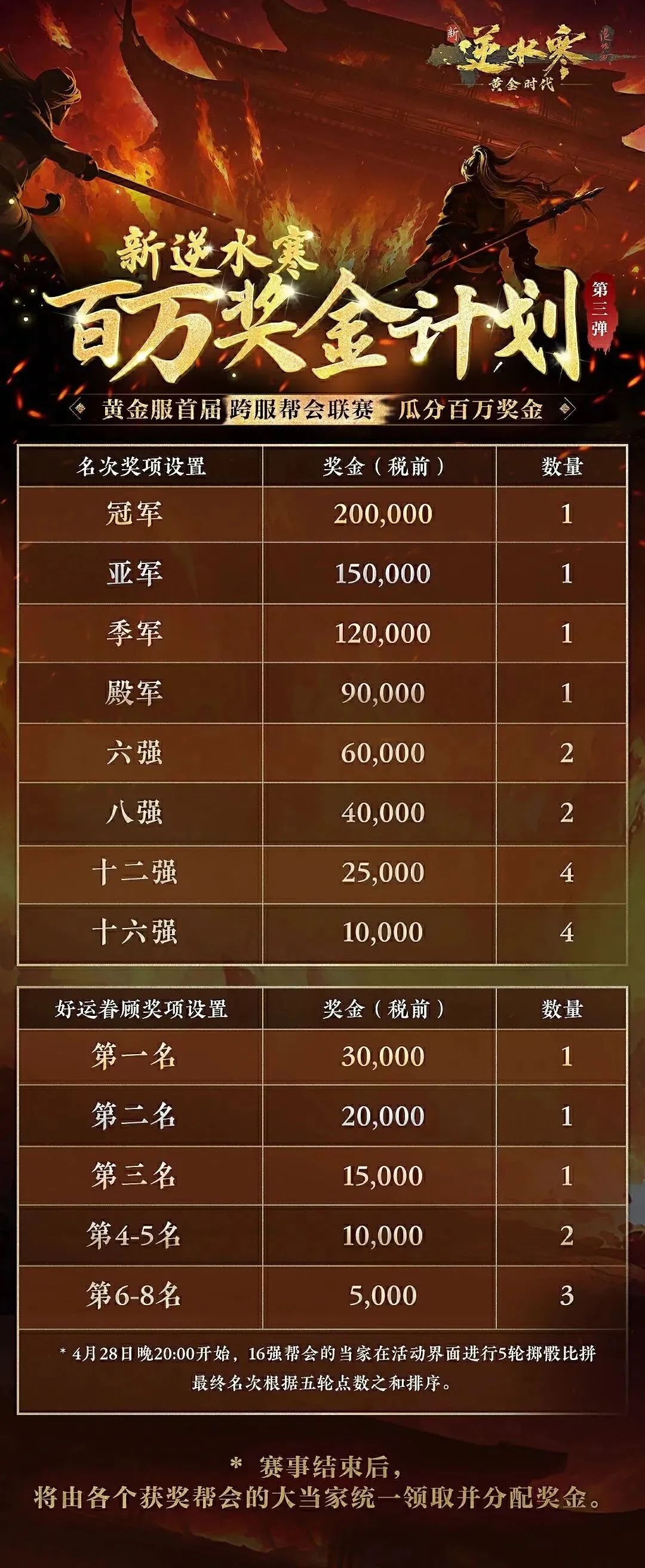剑影横空惊日月,掌风裂地荡乾坤。黄金服首届跨服帮会联赛已于昨日落下帷幕! 为赢得黄金服“天下第一帮”的顶级荣誉,五大服务器的榜上高手齐聚一堂,参赛的每一位选手都代表着江湖实力最高水准! 除了实力的绝对领先,要想在跨服联赛中拔得头筹,考验的更是同门运筹帷幄的战略能力。每场比拼都是才略兼具的武学盛宴,看得台下观众也血脉喷张、激动不已! 经过三日的龙争虎斗,黄金服首届跨服帮会联赛的四强帮会均已诞生,让我们一起送上祝贺,瞻仰豪侠的英姿! 冠 军 恭喜来自新·紫禁之巅服务器,由大当家可爱悠米领衔的【竹雾现云】帮会,夺得黄金服首届跨服帮会联赛冠军! 【竹雾现云】帮会以高瞻远瞩的战略掌控全局之势,恰似 “不畏浮云遮望眼,自缘身在最高层”。打法大气磅礴,进攻时气势如虹,防守时稳如磐石,尽显王者风范,这个冠军他们实至名归! 亚 军 恭喜来自新·烟雨江南服务器,由大当家蓝杉领衔的【醉酒折花】帮会,夺得黄金服首届跨服帮会联赛亚军! 【醉酒折花】帮会的实力同样不容小觑,巧妙运用战术策略,根据局势灵活调整,避实击虚,以奇制胜,颇有 “兵无常势,水无常形” 之妙。他们凭借卓越的实力,在江湖留下了浓墨重彩的一笔! 季军 恭喜来自新·烟雨江南服务器,由大当家等晴天゛领衔的【对酒当歌】帮会,夺得黄金服首届跨服帮会联赛季军! 【对酒当歌】帮会众志成城,有着 “长风破浪会有时,直挂云帆济沧海” 的壮志豪情。面对强敌毫无惧色,以精湛战术和强大实力一次次逆转战局,他们的名字将被江湖永远铭记! 殿军 恭喜来自新·群龙之首服务器,由大当家与眠゛领衔的【藏海】帮会,夺得黄金服首届跨服帮会联赛殿军! 【藏海】帮会士气高昂,每一次冲锋都带着势不可挡的气势,“黄沙百战穿金甲,不破楼兰终不还”。这份荣誉是对他们实力的认可,也是他们团结协作、勇攀高峰的勋章,未来他们必将续写更多辉煌! 让我们再次恭喜以上帮会,在黄金服首届跨服帮会联赛中赢得佳绩! 冠军帮会【竹雾现云】将入驻象征黄金服无上荣誉的荣耀殿堂,并获得专属的限时定制过场加载图,全面彰显至尊荣耀! 加载图示意,画面内容支持个性化定制 夺得冠军、亚军、季军的帮会,将获得相应数量的限时顶级奢华祥瑞【宸雷羲曜】,风雷加身威震武林!八强帮会还将赢得黄金服首发全新荣誉奖杯,永久矗立于帮会领地正门前方的石台之上,铸就“荣誉之路”! 限时顶级奢华祥瑞【宸雷羲曜】 以冠军奖杯为例进行展示 其余名次奖杯样式有所差别 至此,黄金服首届跨服帮会联赛正式落幕,入围十六强的帮会皆可凭借名次,瓜分百万奖金! 若想回顾赛事精彩片段,同门可关注逆水寒黄金服抖音、视频号,将陆续为各位带来赛事高光集锦,回顾燃情战斗时刻! 战火还未停歇,新一届跨服比武大会即将全服打响,正式服与赛季服率先开战,冠军宝座虚位以待! 黄金服首届跨服比武大会也已蓄势待发,角逐武林至高荣誉,又一个百万奖金等你来赢!截止目前逆水寒黄金服已向玩家提供400万元现金奖金作为赛事奖励,未来还将继续赛事活动的投入,敬赠江湖豪杰!赛事详情敬请期待小寒后续爆料。 群雄逐鹿,烽火连天!黄金服【新·风云再起】首次六合青龙争夺已于昨日正式落幕,恭喜以下帮会赢得首杀! 第一战场 大当家烟火带领的【未央】帮会 大当家小柚神带领的【雾隐花下】帮会 六合青龙第一战场胜方可竞拍首杀永久称号【六合青龙之叶棋五】(提高2%全职业伤害),让全江湖见证您的威名! 点击加入叶子猪逆水寒玩家群QQ群:711879579。或者打开微信,扫码添加叶小猪好友,回复“14”,叶小猪将拉你进玩家微信群。 更多逆水寒攻略请关注叶子猪逆水寒专区:http://www.yzz.cn/game/nsh/。 |