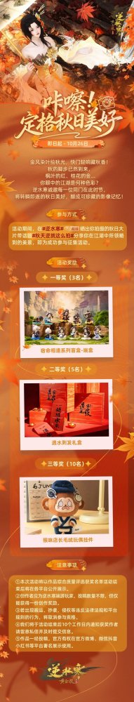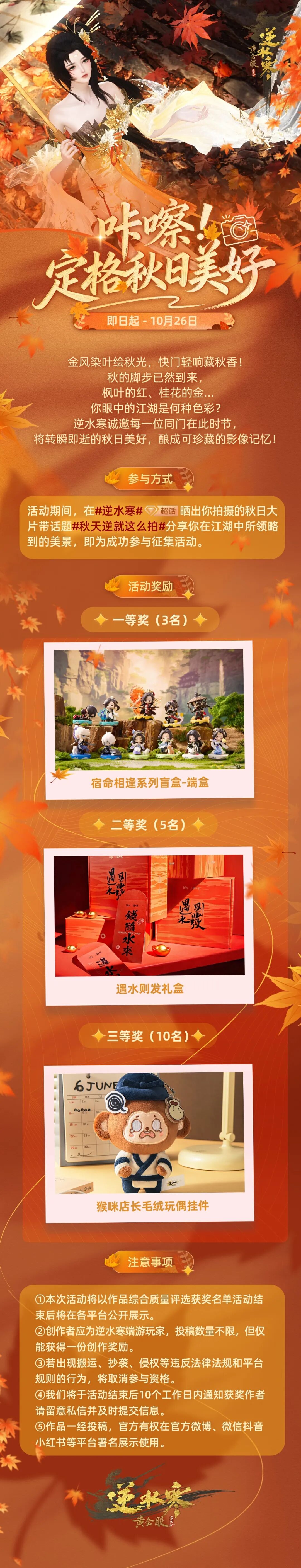 有没有细心的同门发现,街上的树叶已悄悄染上一层金黄,空气中也弥漫着甜甜的桂花香,秋天来啦! 金秋时节,处处皆是如画美景,当然要换上美美的衣服外出拍照啦~ 为帮助同门提高出片效率与质量,小寒特为同门准备了一份无死角出片攻略,手把手助力各位留下最完美的秋日记忆! 不仅如此,晒出你镜头下的江湖秋日大片,还有机会获得宿命相逢系列盲盒、遇水则发礼盒、猴咪店长毛绒挂件等周边好礼,快来一起看看吧~ 构图妙招,美在起跑线 叮咚!逆小寒摄影小课堂开课啦~想拍出氛围感大片,选对构图就是第一步! 除了善用相机自带的九宫格辅助线,江湖中还藏着不少自带构图的 “天然摄影棚”,往里一站就能轻松拍出质感大片! 咱们桃溪村山青水碧,其中还暗藏斐波那契黄金螺旋曲线,站在小寒同款点位,分分钟get大师级效果! 延伸而上的石阶、纵深感十足的小道……巧妙利用空间中的线条,即可掌握透视、对角线构图,收获朋友圈无数点赞! 除此之外,长生观等地还藏着天然的三角形、L形几何构图,同门可直接跟着视频拍同款,定格专属于你的江湖风采~ 要素捕捉,氛围感拉满 掌握了基础的构图技巧,接下来就是为各位的大片注入灵魂——通过关键要素增加满满的秋日氛围! 什么最能代表秋日?当属火红的枫叶!枫语山漫山遍野的红叶热情似火、层林尽染,处处皆是5A级风景! 除了火红的枫叶,出片神器“银杏”也千万不要错过啦!风一吹,银杏叶簌簌落下,铺成满地碎金,身处其中,满是秋日的明亮与诗意。 不仅如此,秋天还是丰收的季节。在照片中增加瓜果时蔬的身影,亦可展现出满满的生命力! 晒出作品,赢周边好礼 看到这里,同门是不是已经迫不及待要将理论付诸实践,开拍属于你的秋日大片了?别急,小寒还有好礼相送! 即日起,同门在逆水寒微博超话,带话题#秋天逆就这么拍#分享你拍摄的秋日大片,就有机会带走宿命相逢系列盲盒(端盒)、遇水则发礼盒、猴咪店长毛绒玩偶挂件周边好礼! 更有严选卡随机掉落,数量有限先到先得哦~ “自古逢秋悲寂寥,我言秋日胜春朝。”小寒已经准备好被同门的秋日大片刷屏了! 点击加入叶子猪逆水寒玩家群QQ群:711879579。或者打开微信,扫码添加叶小猪好友,回复“14”,叶小猪将拉你进玩家微信群。 更多逆水寒攻略请关注叶子猪逆水寒专区:http://www.yzz.cn/game/nsh/。 |