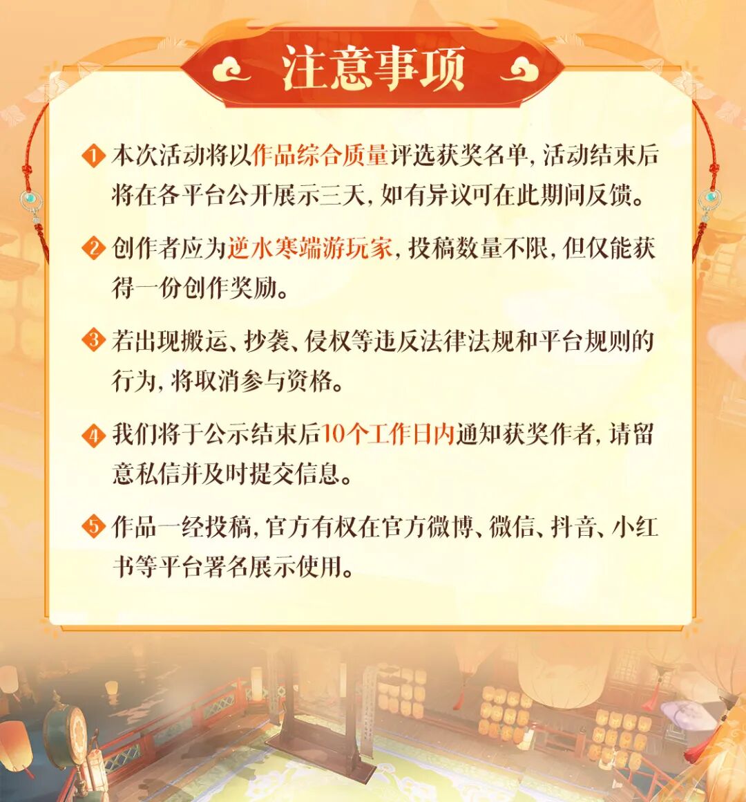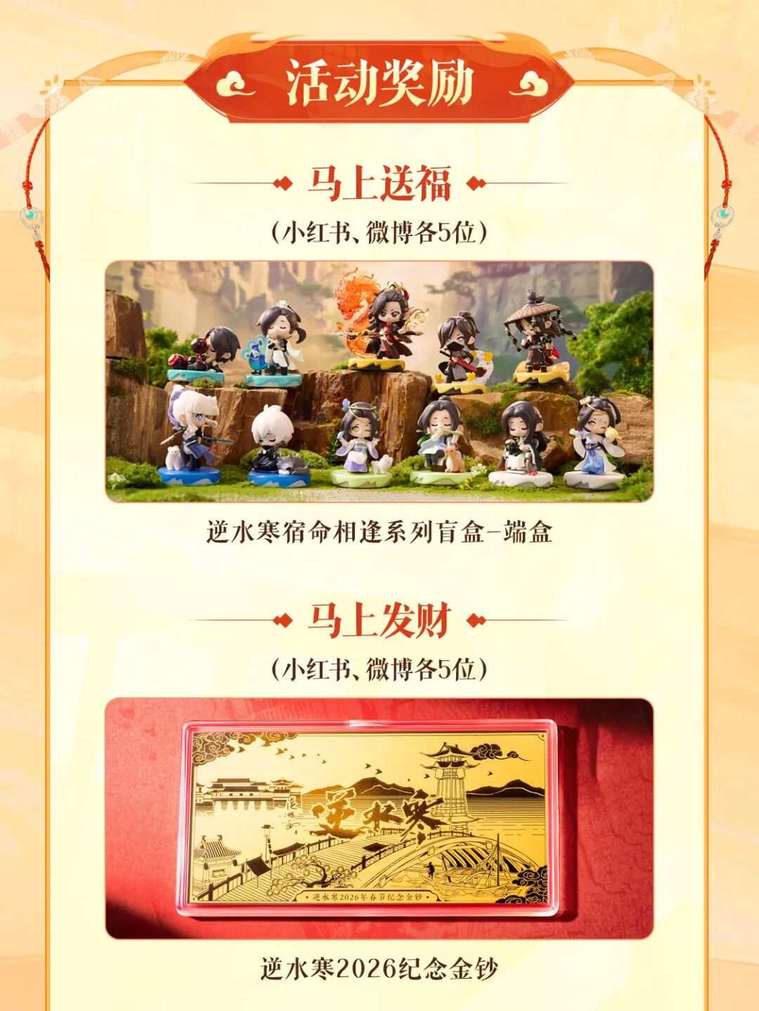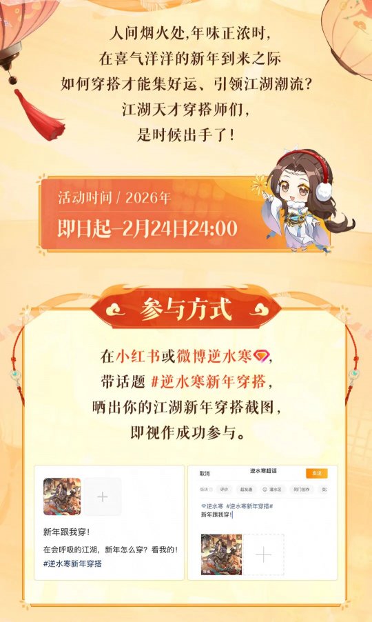 新年脚步渐近,小寒无论走到哪里,都能看见同门们热烈讨论着新年该如何穿搭,大家都想漂漂亮亮、神采奕奕地迎接新的一年呢! 与其独自闭门纠结,不如集思广益,让全江湖的同门一起帮你出谋划策!说干就干,小寒宣布,2026年新年穿搭征集活动【新年穿搭看“逆”们】正式开始! 只要在逆水寒超话或小红书平台,带上话题?#逆水寒新年穿搭,以及自己的穿搭美照,即视为成功参加!各位穿搭大神速来一展身手,用你绝佳品味和超前审美,赢得全江湖的瞩目与喝彩吧! 当然,不白来啊!大家都不白来!小寒专程在仓库里翻了又翻,搬出来不少奇珍异宝送同门——宿命相逢系列盲盒(端盒)、逆水寒2026纪念金钞、逆水寒角色设定集、猴咪店长毛绒玩偶挂件都已备好,你会是它们的主人吗! 小寒可太期待看到大家的作品啦!手里的奖品早已等不及要找到主人,各位同门快来带走它吧!让我们一起美美亮相,开足马力,冲向崭新的一年! 点击加入叶子猪逆水寒玩家群QQ群:711879579。或者打开微信,扫码添加叶小猪好友,回复“14”,叶小猪将拉你进玩家微信群。 更多逆水寒攻略请关注叶子猪逆水寒专区:http://www.yzz.cn/game/nsh/。 |