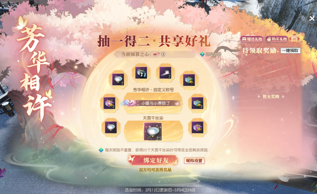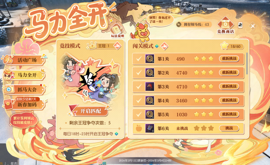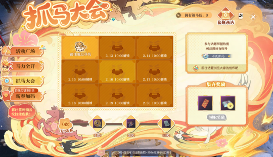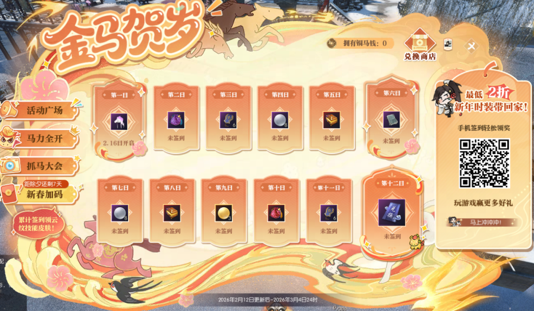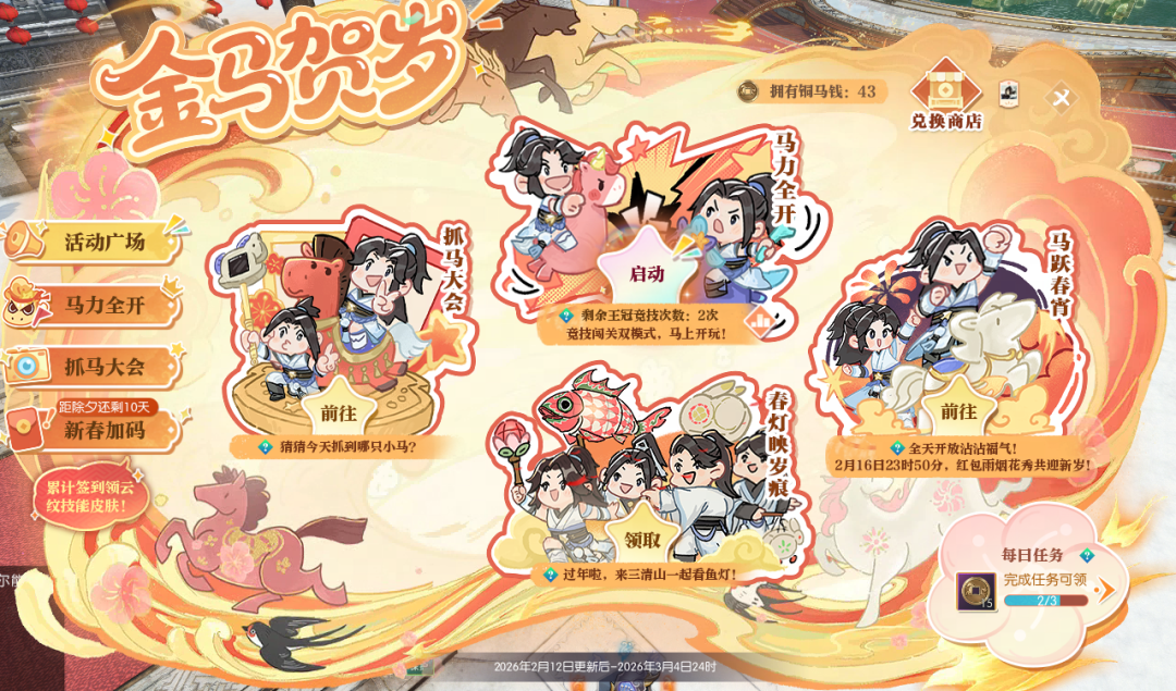 自马年新春福利第一弹惊喜揭晓后,小寒的后台每天都被同门们的热情追问淹没——“这么多福利该怎么全部到手?” 别急,今天江湖福利官小寒就将手把手为大家系统梳理每项福利的获取途径,从限时活动到隐藏彩蛋,一一详解,保证你不错过任何一份新春好礼! 这个春节,除了签到即可免费领云纹技能皮肤,更有马年活动【金马贺岁】、贺岁时装【云绒抱岁】最低2折购、情人节抽一得二浪漫回归……更多精彩且听小寒细细道来! 春节福利轻松领,口袋满满更好玩! 首先是大家最期待的云纹技能皮肤,2月16日起,累计签到满12天即可免费领!(除绝技云纹皮肤外任选一款,若已解锁全部4款非绝技云纹技能皮肤,则可获得40张珍稀外观兑换券) 届时,同门在游戏内春节主题活动【金马贺岁】-【新春加码】处、或在逆水寒小程序【金马贺岁】-互通签到处皆可签到,双端互通,假期出游也不用担心,随时随地领好礼! 同时,每天都有签到好礼,头饰【雪影送福】、承天玉笏(正式服)/北冥精魄(赛季服)/绝技残页(黄金服)等好礼等你来拿! 此外,移动端小程序活动【金马贺岁】升级登场,除了互通签到外,同门还可参与趣味游戏【马上向前冲】,领取称号【马上冲冲冲】、珍稀外观兑换券与活动代币【铜马钱】,狂揽各式好礼! 更有新春贺岁时装【云绒抱岁】砍价大优惠,邀请好友助力砍价,最低2折即可将新装带回家!时装详情敬请期待小寒后续爆料。 金马贺岁,食神时装免费拿! 除了签到领好礼外,高福利、超好玩的新春活动【金马贺岁】,也是同门过年千万不能错过的好地方! 参与活动广场的各项趣味活动,即可获得数量不等的活动代币【铜马钱】,兑换食神主题时装【四食椿香/五味松华】、庄园组件【马跃春宵】、红包封面【瑞马呈祥】、头衔【金马贺岁】、马年表情包等丰厚好礼! 更有丰厚成长道具好礼助你实力进阶—— 正式服:承天玉笏、金玉秘宝兑换券、绝技残章自选礼、圣玉、交子 赛季服:北冥精魄、北冥砂、混沌石、玉石 黄金服:75级玉佩碎片(黄金组服务器)/星龙装备自选券(其他服务器)、交子、金银质硬币、百炼寒光赏、紫色装备匣 食神主题时装【四食椿香/五味松华】 马力全开 马年,自然要像奔腾的马儿一样马力全开!同门可在【马力全开】玩法中,化身可爱小马,在场地中尽情收割金币,迎新年财运滚滚! 若是和对手狭路相逢,还可利用场上的无敌星撞击对手,占得先机吃到更多金币!同时,也要小心被别人撞成幽灵哦~ 同门不仅可通过完成关卡,获得活动代币【铜马钱】、头饰【踏云逐瑞】,正式服同门可获得纳地玉笏、坤泽精粹,赛季服同门可获得混沌石、北冥砂,黄金服同门可获得紫色装备匣、金银质硬币等奖励! 同门还可参与每天3次的竞技比拼,排行榜名列前茅者可获得头像框【马力全开】! 头饰【踏云逐瑞】 头像框【马力全开】 前30名永久,31-100名限时60天 抓马大会 要想马年过得精彩纷呈,小寒首先推荐大家来【抓马大会】一起抓马!活动期间,每日10点将在所有地图随机解锁一个神秘的小马打卡点,静待“抓马”能手来发现! 每日首位抓马成功的同门,还将荣登全江湖的活动页面,成为瞩目的“抓马之星”,帮助大家一起抓马! 累积抓马的次数越多,还可解锁绝技残章自选礼(正式服)/霜星石(赛季服)/绝技残页(黄金服)、珍稀外观兑换券、头衔【马上有钱】、名片背景【马跃春宵】等丰厚奖励! 同时,同门参与游戏内朋友圈#抓马大会#话题讨论,还可根据热度获得独有称号【不如抓马】! 马跃春宵 新年最最重要的,当然是沾福气! 来【马跃春宵】踩福垫,就能一飞冲天,若是稳稳降落至福垫中心,还可以触发惊喜烟花祝福哦! 除夕夜(2月16日)23时50分,还有红包雨与金马贺岁烟花秀惊喜来袭,爽拿海量交子/绑定铜钱好礼,让我们欢欢喜喜共迎新岁! 此外,2月15日起,减负活动【舌尖上的大宋】将再度上线,100%全额补领,助力同门放心走亲访友,奖励和快乐都不会落下! 情人节甜蜜加倍,买一得二超划算! 今年新春还与浪漫的情人节相携到来,可谓是喜上加喜!双人清空式不重复抽奖【芳华相许】为你送来双重甜蜜! 本周四更新后,【芳华相许】将全服上线,抽一得二,双人共享好礼,还有机会带走全新自定义称号【xx与xx锁了】! 本次活动规则不变,同门与好友绑定后,赠送芳华相许系列礼物即可获得倾慕之心(双方共享),可用于奖池抽奖。 每次抽取,双方皆可获得奖励,最多4次,必得自定义称号;最多10次,必可搬空奖池!若提前获得终极大奖【25个天霓千丝染】,还可直接清空奖池,带走名片动作【心跳奇袭】在内的奖池所有好礼! 名片动作【心跳奇袭】 与此同时,【芳华相许赠礼/收礼活动排行榜】再度开榜,赠人玫瑰手有余香。 结算时位于排行榜前列的同门,即可根据名次获得珍稀祥瑞【焚莲灼日】、炽翼火舞自选匣、限时称号【玉翎·青鸾挽云芷】/【玉翎·灵凤衔霞英】、【兰蕙绾心】/【芳桃缀情】、限时名片·玉翎、限时头像框·云芷/头像框·霞英等珍稀好礼! 珍稀祥瑞【焚莲灼日】 炽翼火舞自选匣 使用后可获得祥瑞【火舞燎原】或祥瑞【炽翼明空】 金马腾跃贺新岁,张灯结彩春满堂!这个马年玩得尽兴嗨翻天,更要盆满钵满、满载而归,把好运通通抱回家! 本周四,就让我们一起前往【金马贺岁】的活动现场,为马年讨个红红火火的开门彩! 明日,小寒还将带来新春福利第二弹