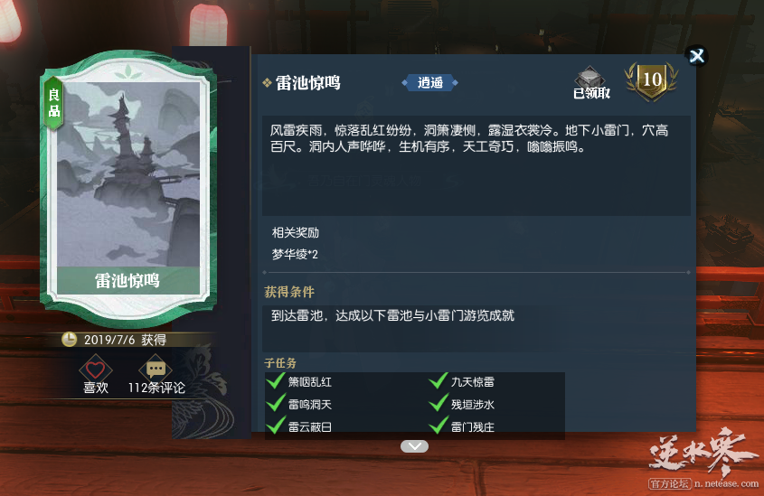 说英雄卡片【雷池惊鸣】获取方式 地点:雷池 萧咽乱红:[437,501]附近,使用动作“吹箫” 九天惊雷:飞到能天殿塔顶即可 残垣涉水:到达[290,243]即可 雷云蔽日:到达[153,513]即可 雷门残庄:到达[119,396]即可 地点:小雷门 雷鸣洞天:[126,239],使用动作“观察”(要注意是奔雷堂的三楼,不是塔顶) 达成后可获得:梦华绫×2 点击加入叶子猪逆水寒玩家群QQ群:711879579。或者打开微信,扫码添加叶小猪好友,回复“14”,叶小猪将拉你进玩家微信群。 更多逆水寒攻略请关注叶子猪逆水寒专区:http://www.yzz.cn/game/nsh/。 |