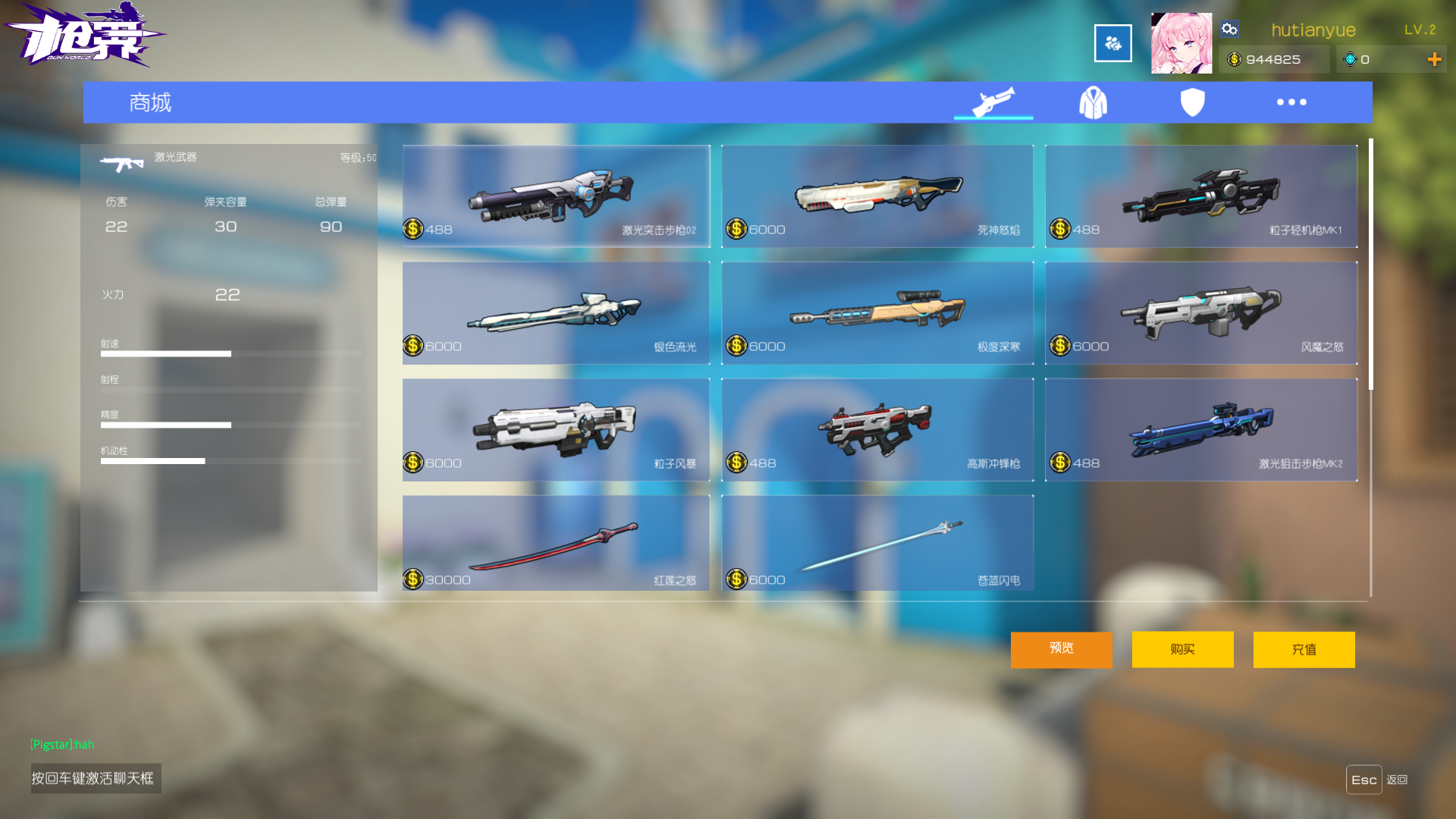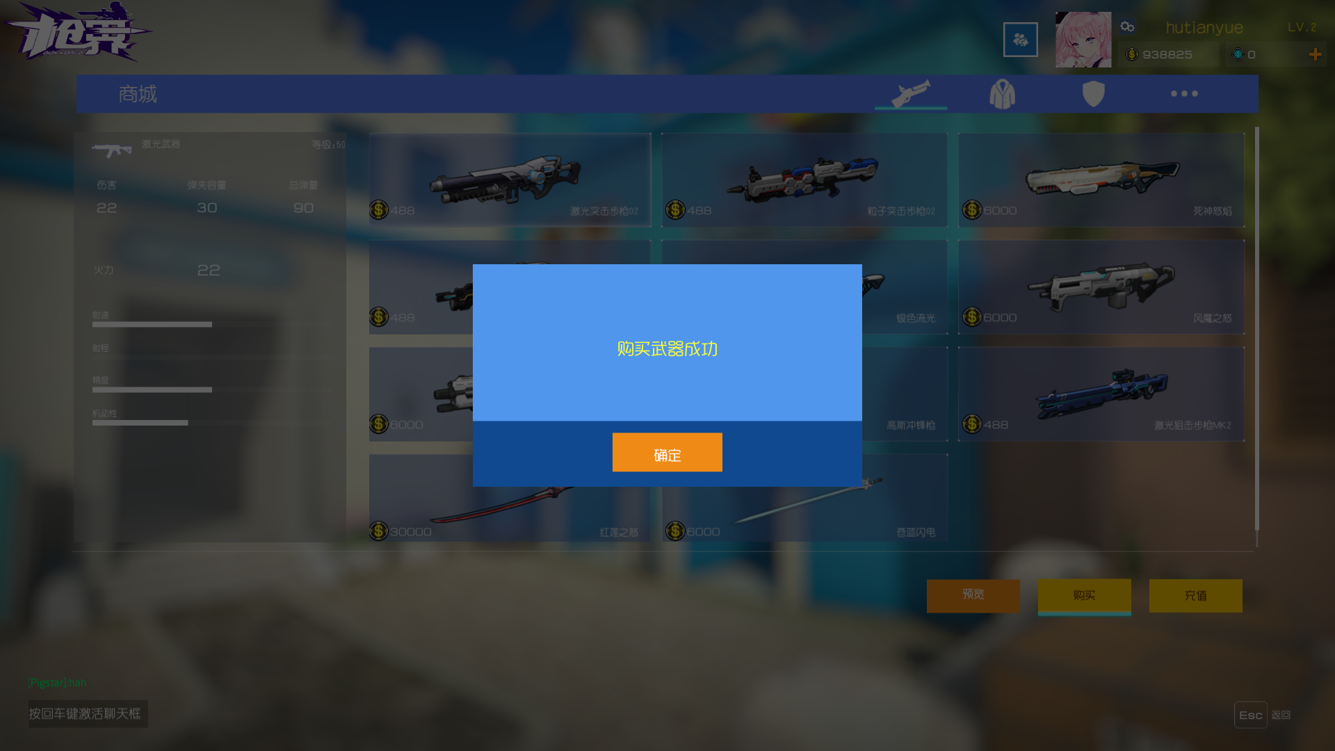 首先进入游戏主页面左侧功能按钮,点击“商城”按钮进入游戏商城。 在游戏商城中,我们可以看到商城中出售的道具列表。有枪械、角色、其他道具等。 我们可以通过选中不同的枪械(近战武器)查看对应的属性。 现在我们准备购买一把深度极寒。选中对应枪械在屏幕左侧区域查看枪械属性 点击“预览”按钮可以看到对应枪械的外观造型,可以通过鼠标拖动进行旋转。 点击“购买”按钮,扣除相应金币,提示购买成功。确定后点击ESC返回主页面进行查看。 进入武器页面,选中深度极寒,点击查看武器详细信息。 了解更多相关信息,请前往http://www.yzz.cn/game/qj/ |