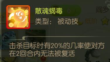 阎罗蝎虽然背景里介绍有毒性效果,但是它的技能中并没有印象中那种类似减伤的毒性debuff,而它默认的被动是可以让对方在被杀死时能有20%的几率无法复活,这个技能的触发率不高,所以亮点不是特别大。