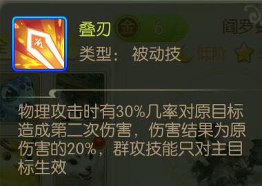 叠刃(被动):物理攻击时有30%几率对原目标造成第二次伤害,伤害结果为原伤害的20%,群攻技能只对主目标生效。