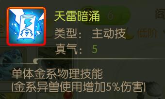 天雷暗涌(真气5):单体金系法术技能(金系异兽使用增加5%伤害)