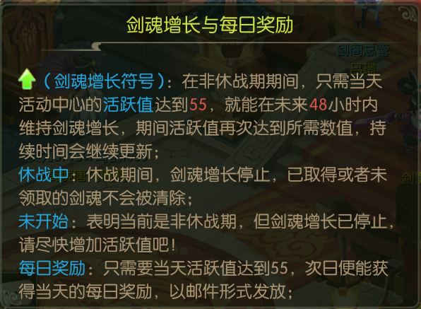 若少侠在当天活跃值达到55的话,则剑魂会在未来48小时(休战期除外)中不断累积,只需偶尔收取一下即可;