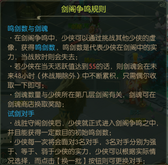 【活动描述】:每天12点至24点期间可参与剑阁争鸣,在剑阁中挑战其他剑侠的幻形,并登上更高级的剑阁,取得更好的奖励。每两周周五10点3分,最终层会结算排名奖励,获得大量元宝!(每天活跃值达55后,48小时内剑魂自然增长)
