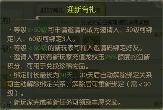 蜀境传说邀请码奖励,蜀境传说如何邀请别人?今天我给大家简单介绍一下邀请码制度。 在蜀境传说里,一旦你的人物达到了50级,可以在左上角的福利里面找到迎新有礼成为邀请人,邀请人的作用是你可以在游戏里找一个小伙伴或者你拉一位现实的小伙伴一起玩,你把你的邀请码给他,他复制你的邀请码绑定后,完成一系列任务,你们两个人可以获得相应的奖品,当你达到60级那么你可以邀请的人增加到3人。 1、通过左上角的福利点击进入福利列表。 ![]() 2、在福利列表下拉找到迎新有礼。如果你够了50级就可以获取一个激活码。 ![]() 3、邀请绑定规则。等级小于30的小伙伴可以邀请绑定,如果是超过30就不能绑定了。所以这里强烈建议大家进游戏之后稍微熟悉界面后,就找个师傅或者在世界频道喊一下看看有没有可以绑定,不过因为最多只能绑三个,如果世界上面没有人,那么你可以来叶子猪蜀境传说交流群里找其他小伙伴邀请绑定,一键加群>> ![]() 4、当你成功绑定之后,你可以发现你有很多列表任务,你逐个完成就会有相应的奖励,萌新的奖励有金钱、宠物洗练道具、助战提升道具、打造材料等。非常丰富。 而邀请人也可以得到一些强力助战的碎片,一举两得。