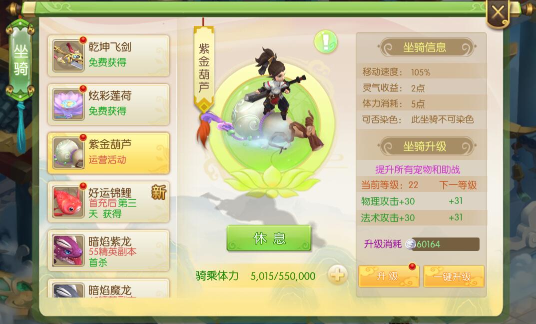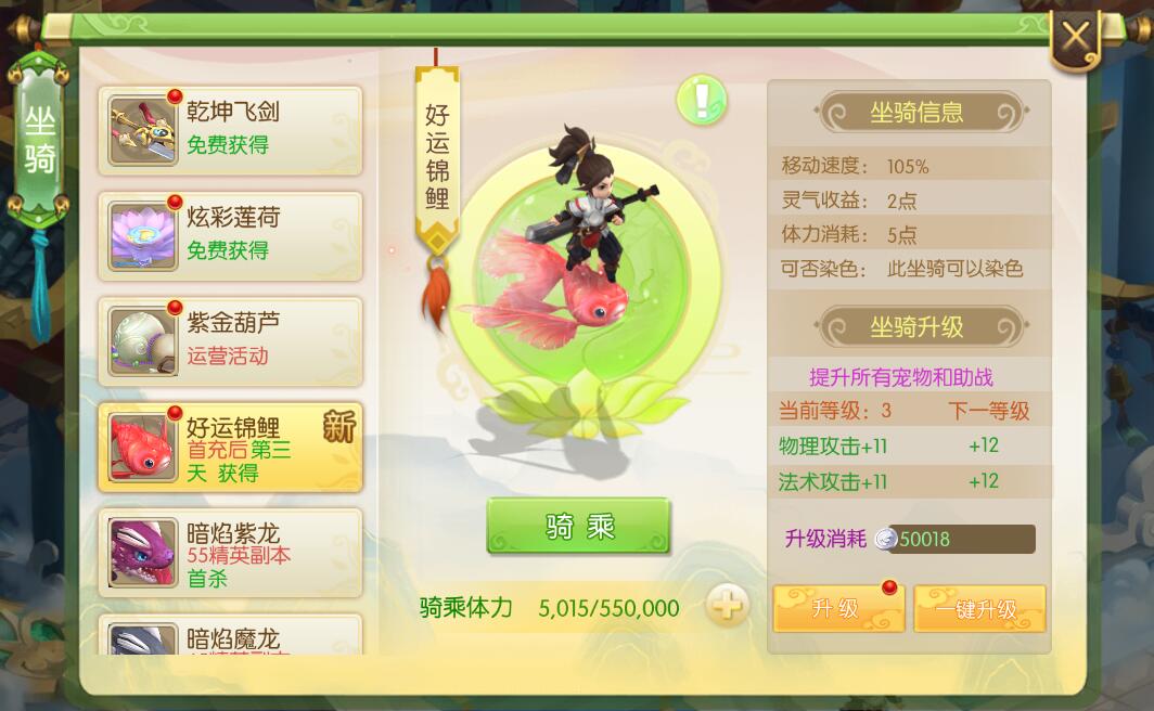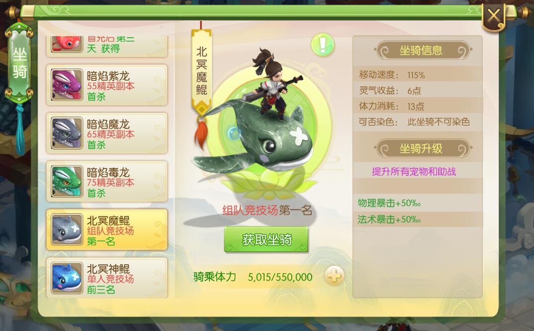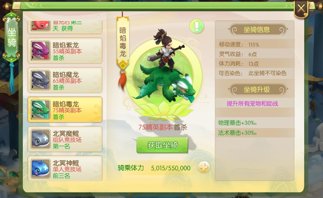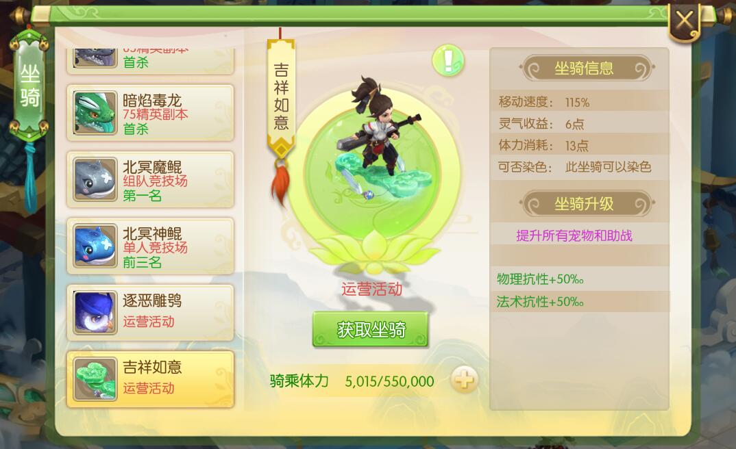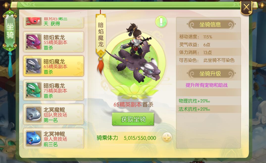 蜀境传说坐骑获取方式,蜀境传说坐骑如何获取,蜀境传说坐骑属性介绍,这些是最近玩家比较关心的,今天我来给大家介绍一下蜀境传说中的坐骑获取方式和它能给玩家带来多少属性上的加成。 坐骑在哪里看 进入游戏后,在右下角的十字按钮点击一下,就可以看到坐骑选项,如下图所示。 坐骑列表 点击坐骑进入坐骑展示页面,这里可以看到全部坐骑的信息,目前蜀境传说的坐骑有11个。下面我简单介绍这些坐骑的获取方式和他能给玩家带来的属性效果。 乾坤飞剑 获取方式:免费获得 属性加成: 移动速度:105%、灵气收益:2点、体力消耗:5点、可染色、可以为全部宠物和助战增加物理防御和生命上限。 炫彩莲荷 获取方式:免费获得 属性加成: 移动速度:105%、灵气收益:2点、体力消耗:5点、可染色、可以为全部宠物和助战增加法术防御和生命上限。 紫金葫芦 获取方式:运营活动 属性加成: 移动速度:105%、灵气收益:2点、体力消耗:5点、不能染色、可以为全部宠物和助战增加物理攻击和法术攻击。 好运锦鲤 获取方式:首充三天后获得 属性加成: 移动速度:105%、灵气收益:2点、体力消耗:5点、能染色、可以为全部宠物和助战增加物理攻击和法术攻击。 暗焰紫龙 获取方式:55级精英副本 属性加成: 移动速度:115%、灵气收益:6点、体力消耗:13点、不能染色、可以为全部宠物和助战增加物理暴击和法术暴击。 暗焰魔龙 获取方式:65级精英副本 属性加成: 移动速度:115%、灵气收益:6点、体力消耗:13点、不能染色、可以为全部宠物和助战增加物理抗性和法术抗性。 暗焰毒龙 获取方式:75级精英副本 属性加成: 移动速度:115%、灵气收益:6点、体力消耗:13点、不能染色、可以为全部宠物和助战增加物理暴击和法术暴击。 北冥魔鲲 获取方式:组队竞技场第一名 属性加成: 移动速度:115%、灵气收益:6点、体力消耗:13点、不能染色、可以为全部宠物和助战增加物理暴击和法术暴击。 北冥神鲲 获取方式:单人竞技场前三名 属性加成: 移动速度:115%、灵气收益:6点、体力消耗:13点、不能染色、可以为全部宠物和助战增加物理暴击和法术暴击。 逐恶雕鸮 获取方式:运营活动 属性加成: 移动速度:105%、灵气收益:2点、体力消耗:5点、能染色、可以为全部宠物和助战增加物理暴击和法术暴击。 吉祥如意 获取方式:运营活动 属性加成: 移动速度:115%、灵气收益:6点、体力消耗:13点、能染色、可以为全部宠物和助战增加物理抗性和法术抗性。 看到这里相信大家对于坐骑都有一个清晰的了解了,在蜀境传说中不同的坐骑能够给你的宠物和助战带来不同的效果,因此各位需要针对不同的坐骑所带来的属性来针对性的佩戴,这样能够让你在面对不同环境下也能够游刃有余。 以上就是蜀境传说坐骑获取和属性介绍的全部信息,如果还想了解更多蜀境传说的信息,请关注叶子猪蜀境传说官方合作专区。 |