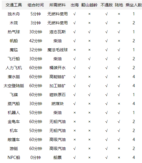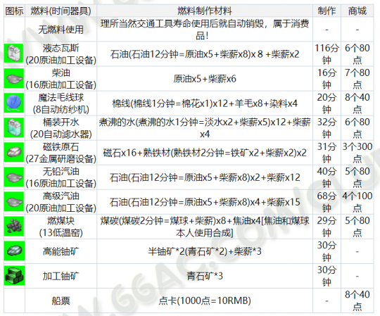 交通工具可以使用替代燃料说明: 新增可制作燃料物品功能,在制作出来以后,可以替代交通工具的损耗度,每一种交通工具都会有指定的消耗燃料,在交通工具已经携带在身上,且将制作出的燃料也携带在身上,要搭乘交通工具的时候就双点该燃料,在原本交通工具的耗损状况红色bar条下,会多一条蓝色的bar条,此蓝色的bar条就是可替代原交通工具耐久度的燃料耗损量。只要此蓝色的bar条尚未耗尽,交通工具就不会继续损坏,而且如果玩家身上携带多量的替用燃料,就可以不断的补充,安心的进行航海大业了。在此要提醒玩家的是,燃料并不会回复交通工具的耐久度,所以身上如果没有携带燃料的话,就会马上造成您的交通工具的损耗啰。 另外,蓝色的 bar 条最大值(MAX值),将等于该交通工具的最大耐用值,当蓝色的bar条增加到最大的时候就无法再往上,请各位玩家多多斟酌使用。(比照 使用补品回复Hp或Sp的方式) 交通工具大全: ![]()