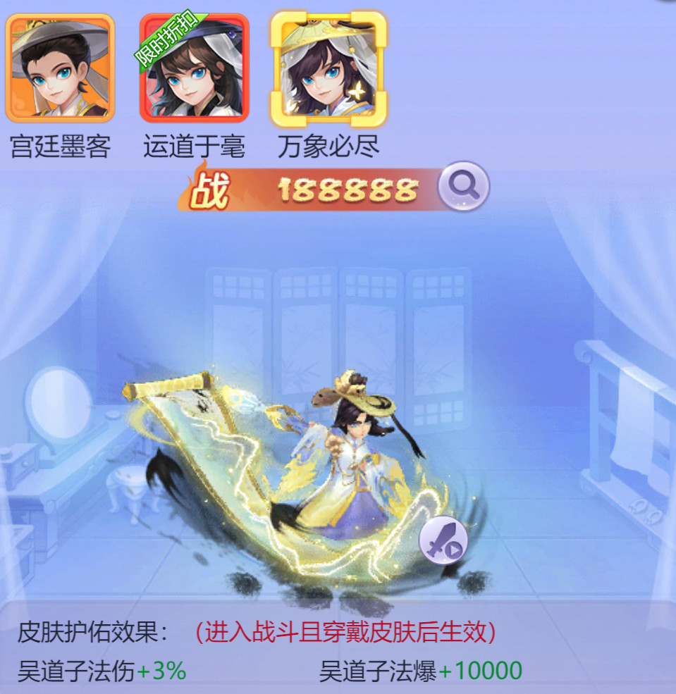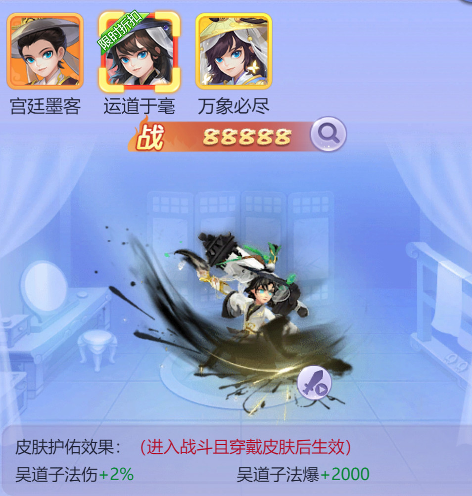 梦幻西游网页版再添新星!全新金色伙伴“吴道子”来袭~ 1、“穷丹青之妙”活动将于2022年11月30日20:00-2022年12月31日24:00期间开启,等级达到220级的玩家可在活动中消耗“星辰碎片”祈愿获得全新金色伙伴吴道子 吴道子拥有宫廷墨客、运道于毫、万象必尽三款皮肤 其中万象必尽为活动专属限时皮肤,穿戴时吴道子法伤+3%,法爆+10000 运道于毫为活动期间限时打折皮肤,穿戴时吴道子法伤+2%,法爆+2000 群英商店、荟英楼、聚仙殿开启吴道子的兑换或抽取 2、小试牛刀玩法新增挑战怪“绝世武痴” 更多伙伴资讯,请关注叶子猪《梦幻西游网页版》官方合作专区。 |
