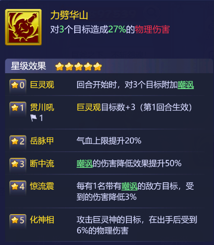 嘿!少侠! 风云际会,天地变幻,有个高大威猛的身影,手持铁斧,斧光如电,一斧之下,万物化灰! 它!就是伟岸而威猛的神灵,巨灵神! 这次巨灵神大人光临咱们长安城小梦都被其威猛的身影震慑到!早就听说过巨灵神大人的传说,没想到这真的大驾光临了! 想必各位少侠对它也充满好奇,那就且听小梦慢慢道来... 技能总览 机制详解 伙伴类型:物理 攻击数量:3 巨灵神-力劈华山 对3个目标造成27%的物理伤害 巨灵观 回合开始时,对3个目标附加嘲讽 升至1-2星,第一回合巨灵观嘲讽目标数+3,并且气血上限提升20% 3星之后,被嘲讽的敌方对己方目标造成伤害进一步降低,减伤能力大大提升 4星之后,场上每有1名带有嘲讽的敌方单位时,巨灵神受到的伤害降低3% 5星后,到达完全体,在保证生存的前提下,进一步提升输出能力 伙伴短评 巨灵神是游戏中第一个拥有“嘲讽”能力的红色伙伴,集“保护”和“生存”为一体。在前期能够为己方队友降低伤害,也能吸引敌方输出火力,后期能凭借长线的生存积累对敌方的受击伤害。 不得不说,巨灵神算是一个具备反手能力的超强肉盾了,在队伍的生存压力比较大时会有不错的表现。 培养建议 0-2星:可用于吸引敌方的攻击火力,减少我方其他单位的受击 3星:减伤大幅提升,保护队友的能力发生质变 4星:大幅增强巨灵神自身的生存能力,能更持续地保护我方 5星:进入完全体,在保护我方的同时,为敌方施加长线的生存压力 看完巨灵神的大致介绍,各位少侠心里是否都有“想法”了呢?欢迎少侠留言告诉小梦哟~ |