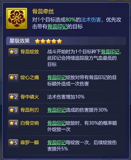 8月咱们迎来了全新的金卡伙伴“骨蕊夫人”!这是一位极具神秘色彩的角色,外表冷艳,内心深处却有着难以割舍的爱和怀念! 今天小梦也要给各位少侠,好好介绍一下她。 技能总览 机制详解 伙伴类型:法术 攻击数量:1 骨蕊夫人-骨蕊牵丝 对1个目标造成80%的法术伤害,优先攻击带有骨蕊印记的目标 骨蕊绽放 战斗开始时为1个目标种下骨蕊印记,此印记会持续追踪敌方气血最低的目标 骨蕊印记: 受到5次攻击伤害时印记绽放,对所有敌方目标造成10%的法术伤害,不可净化,持续到骨蕊夫人离场。 升至1-2星:对带有印记的目标额外伤害加多一次,自身法术伤害增加10% 升至3星:骨蕊印记绽放时,对所有敌方目标造成的伤害提升30%,面伤能力增强 升至4星:有30%的概率,可对敌方所有目标再增加一次骨蕊印记伤害 到达5星:后续印记每绽放一次,绽放伤害提升5%,持续提升附加的输出能力 伙伴短评 骨蕊夫人的出现,法系伙伴又添一员强将,自身具备高额的法术伤害能力,且携带的骨蕊印记又有叠加的伤害加成。 因为骨蕊夫人附带的“骨蕊印记”可以额外造成群体伤害,可以搭配能提供多段段数的伙伴,比如拥有狐火凝结的有苏鸩,和骨蕊夫人契合度较高。 当对方目标受到5次时,可为有苏鸩增加狐火,有苏鸩的狐火追击又可触发骨蕊夫人的印记绽放,互相联动可带来超强的爆发输出。 培养建议 0-1星:可作为常规法系伙伴使用,并附带额外印记伤害输出,可搭配能提供多段段数的伙伴使用 2-3星:进入强势期,自身法术伤害能力和附加伤害能力进一步得到提升 4星:产生质变,有概率可额外增加印记伤害 5星:进入完全体,附加伤害能力进一步叠加 以上就是本期全部内容,更多伙伴心得,请锁定叶子猪《梦幻西游网页版》官方合作专区。 |