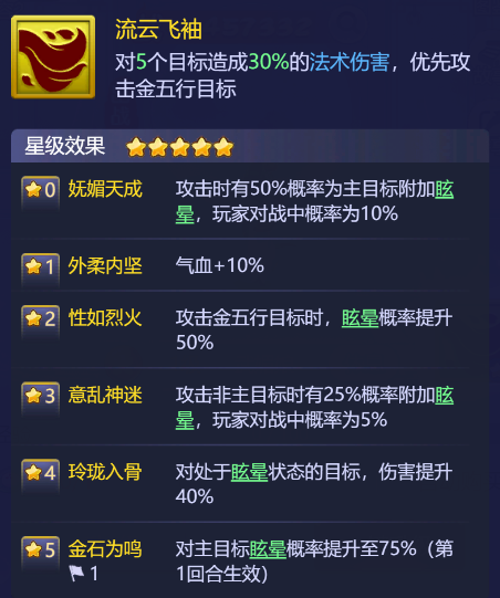 这个女子,她外貌风华绝代,她头脑聪慧过人,是一个独具魅力的传奇女性。 在历史长河里面,有着浓墨重彩的一笔,如今她来到咱们的长安城内,又会带来怎样的惊喜呢? 今天就让小梦带各位少侠好好认识一下咱们这位新伙伴吧。 先给大家介绍下 武媚娘的推荐获取途径吧 获取途径 1、点击进入“芳华倾世”,使用“荟英令-武媚娘”进行抽取 2、点击“芳华战令”,进行获取 技能总览 机制详解 伙伴类型:法术 攻击数量:5 武媚娘-流云飞袖 对5个目标造成30%的法术伤害,优先攻击金五行目标 妩媚天成 攻击时有50%概率为主目标附加眩晕, pvp中概率为10% 升至1-2星,自身气血增加10%,攻击金五行目标时,眩晕概率提升50% 3星之后,在攻击非主目标时,有25%的概率附加眩晕,pvp中概率为5%,如果是攻击金五行目标,还可以在原有3星基础上额外获得2星增益,提升眩晕概率 4星之后,对处于眩晕状态的目标伤害提升40%,等同于在原有控制的基础上,大幅度提升了伤害输出 5星后,达到完全体,对主目标的眩晕概率大幅提升至75%,且在第一回合就生效,如攻击目标为金五行目标,同样会额外提升眩晕概率 伙伴短评 武媚娘,一个集“控制”+“输出”为一体的伙伴,特别是对金系伙伴有着强大的控制能力,所以控制系伙伴的队伍又添一员大将。 她能够在需要群秒控制的pve场景中保命输出,也能在pvp中控制多个敌方单位,提高我方的胜率,相信在后续的pvp中,有较高的亮相机会和不错的表现。 培养建议 0-1星:可作为常规法系控制伙伴使用 2星:攻击金五行目标时,控制能力的概率得到显著提升 3星:额外增加了对非主目标的控制,pvp中也相应附加了控制能力的概率 4星:进入强势期,对处于眩晕的目标,增加高额伤害 5星:达到完全体,对主目标的控制能力进一步提升,且在第一回合就生效 看完了武媚娘的大致介绍少侠们是不是都“蠢蠢欲动”了呢?赶紧进游戏获取她吧。 更多伙伴介绍,请锁定叶子猪《梦幻西游网页版》官方合作专区。 |