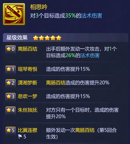 “十年一觉长安梦 舞雩风箫几人知” 少侠,且慢,你听说了没有,咱们长安城呀,来了一位才貌双全的道姑! 容貌娇美动人,宛如仙子下凡。 又会吟诗作对,吹箫更是一绝,悦耳动听,令人不禁连连称赞~ 小梦都迫不及待,要向你好好介绍一下她了~ 让我们先来看看,她的推荐获取途径吧! 获取途径 1、点击进入“蕙心兰质”,使用“招贤令”进行抽取 2、点击“风华战令”,进行获取 技能总览 机制详解 伙伴类型:法术 攻击数量:3 鱼玄机-相思吟 对3个目标造成35%的法术伤害 离肠百结 出手后额外发动一次攻击,对1个目标造成26%的法术伤害。 升至1星:伤害提升15% 升至2星:离肠百结造成伤害提升20% 升至3星:伤害再次提升15% 升至4星:对方只有一个目标时,伤害提升20% 升至5星:第五回合额外发动一次离肠百结 伙伴短评 鱼玄机,法术秒3伙伴,附带一次单体追击。由于追击的高倍率,无论是面对3怪还是面对单怪,鱼玄机都可以打出强力的输出。 升星后,可以获得稳定的输出能力,进而提升收益。到达5星,在第5回合额外释放一次追击,可发挥不错的清场作用。 总体来说,是一名较好的纯输出型橙色伙伴,在推图玩法中,二十八星宿的三怪和单怪关卡都有妙用,推荐各位少侠抓紧入手噢~ 培养建议 0星:常规法术秒3伙伴 1星:对1个目标额外发动一次追击 2-3星:伤害输出层层叠加 4星:敌方只有1个单位时,再次提高伤害输出 5星:第五回合额外发动再一次追击 之前有少侠留言在问,怎么还不出橙卡呀,呐,鱼玄机出现了!这位才貌双全道姑的来到,为橙色伙伴增加一名高输出大将,升星之后有着不俗的表现,少侠可以考虑将其纳入队之中哟~ 更多伙伴资讯,请锁定叶子猪《梦幻西游网页版》官方合作专区。 |