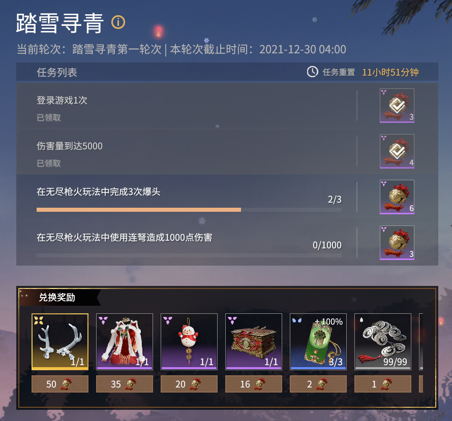各位英雄们好呀~相信大家已经在游戏里体验到“打雪仗”的乐趣了,寒冷冬天怎么能缺少朋友的陪伴?快叫上你的小伙伴共同体验冬季限时活动吧~ 踏雪寻青 活动时间: 2021年12月23日开服后至2022年1月6日04:00:00 限时签到活动开启: 活动期间内,玩家累计活动签到7日可获得活动头像、太刀皮肤【龙弧·映雪】、破阵宝箱等活动奖励。 累计签到第一日:活动挂饰【盘长结】 累计签到第二日:活动太刀皮肤【龙弧·映雪】 累计签到第三日:古币x800 累计签到第四日:活动头像【冬青】 累计签到第五日:破阵通币x4 累计签到第六日:活动气泡【斗剑】 累计签到第七日:破阵宝箱x1 限时踏雪寻青活动开启 活动规则: 活动期间内包含两个活动轮次,玩家可在轮次开启后选择独特的高级奖励作为本轮次的高级奖励。完成活动内任务可获得兑换道具【吉祥铃】用以兑换相应独特奖励。 (迦南专属皮肤宝衫·金铃) 轮次时间: 第一轮:2021年12月23日开服后 至2021年12月30日03:59:59 第二轮:2021年12月30日04:00:00 至2021年1月6日03:59:59 雪鹿雄角/雪鹿雌角 踏雪寻青活动上线,丰厚奖励祝你温暖过冬!不知诸位英雄对今日上线的【无尽枪火】模式体验如何?一起来评论区讨论一下。 |