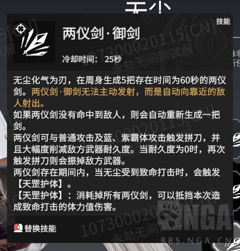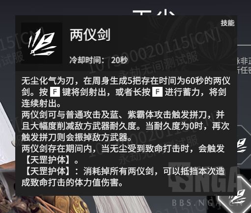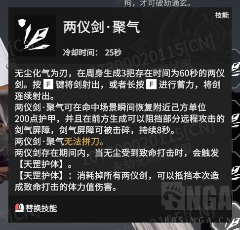永劫无间全新英雄无尘已经正式曝光了,官方也发布了相关的演示视频,如果没有看过的小伙伴可以来这里再复习一下:永劫无间新英雄无尘演示动画>> 不过相信很多小伙伴最想关注的应该就是他的技能了。根据参与测试服的小伙伴透露,无尘自从加入了测试服后也进行过第一次的技能改动,下面我们一起来了解一下改动后的技能如何。 角色展示画面 技能展示 F技能:两仪剑 无尘化气为刃,在周身生成5把存在时间为60秒的两仪剑。按F键将剑射出,或长按F进行蓄力,将剑连续射出。两仪剑可以普通攻击、蓝、紫霸体攻击触发拼刀,并且大幅度削减敌方武器耐久度。当耐久度为0时,再次触发拼刀将会振掉对方武器。两仪剑存在期间,当无尘受到致命打击时会触发天罡护体。 天罡护体:消耗掉所有两仪剑,可以抵挡本次造致命打击的体力值伤害。 这个技能的特点是可以单点射击、连射、减对方耐久、可以拼刀、加防御罩子。可以说是攻防兼备的技能。这也太顶了一点吧。 分支技能: