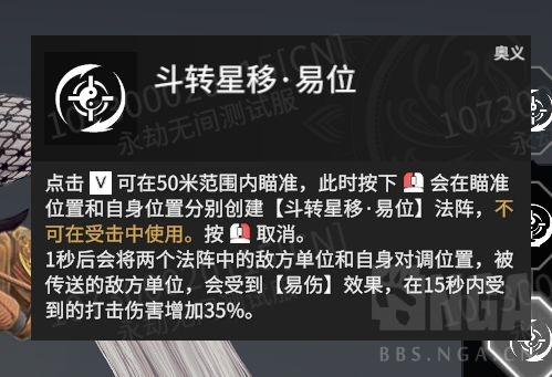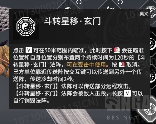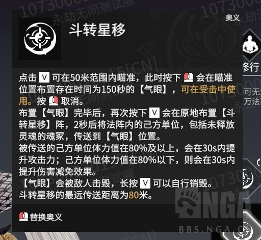 奥义技能 V技能:斗转星移 点击V可在50米范围内瞄准,此时按下鼠标左键会在瞄准位置布置存在时间为150秒的气眼,可在受击中使用。按鼠标右键取消。 布置气眼完毕后,再次按下V会在原地布置斗转星移阵,2秒后将法阵内的己方单位,包括未释放灵魂的魂冢,传送到气眼位置。被传送的己方单位体力值在80%及以上,会在30秒内提升攻击力;己方单位体力值在80%以下,则会在30秒内提升伤害减免效果。 气眼会被敌人击毁,长按V可以自行销毁。斗转星移的最远传送距离为80米。 分支技能: